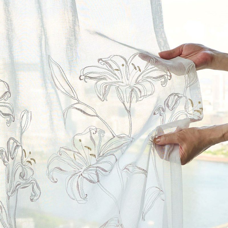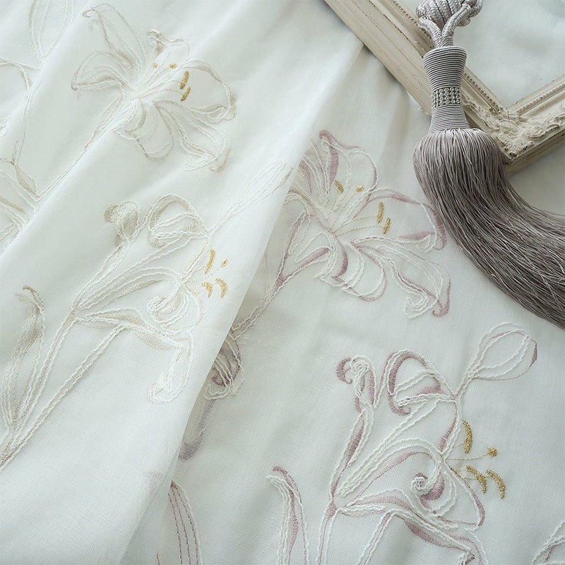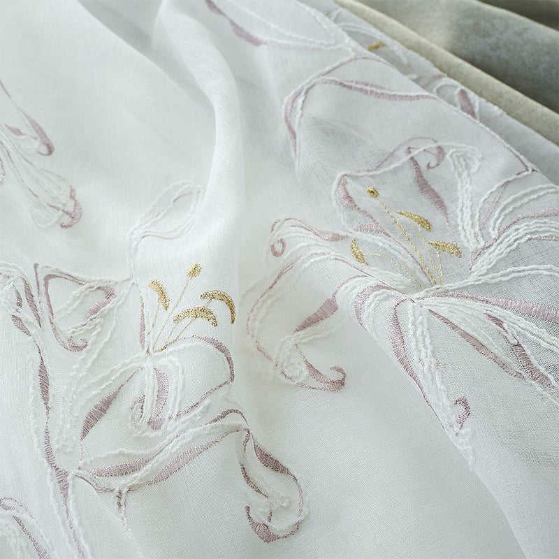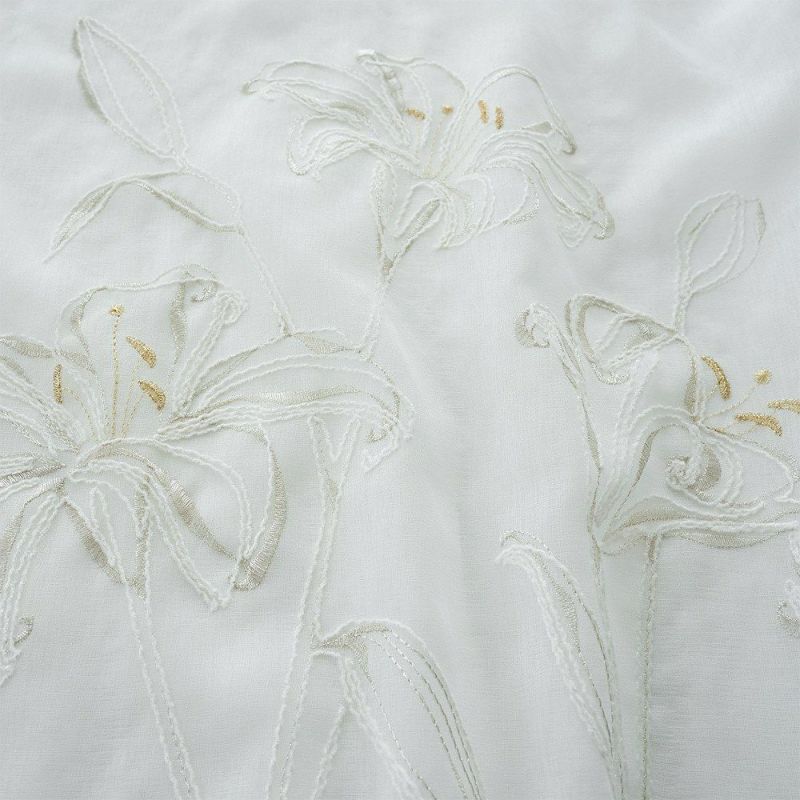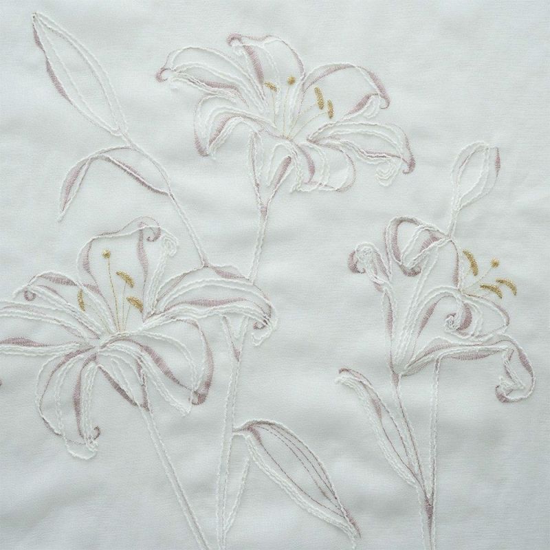 朝の光がレースを透かすたび、カサブランカ刺繍の花々がふわりと煌めく。繊細な糸が描く曲線が、窓辺をエレガントに引き立てます。日常に上質な美しさを添える、心を満たす光景。静かな時間の中に、花々の息づかいを感じるひとときを。