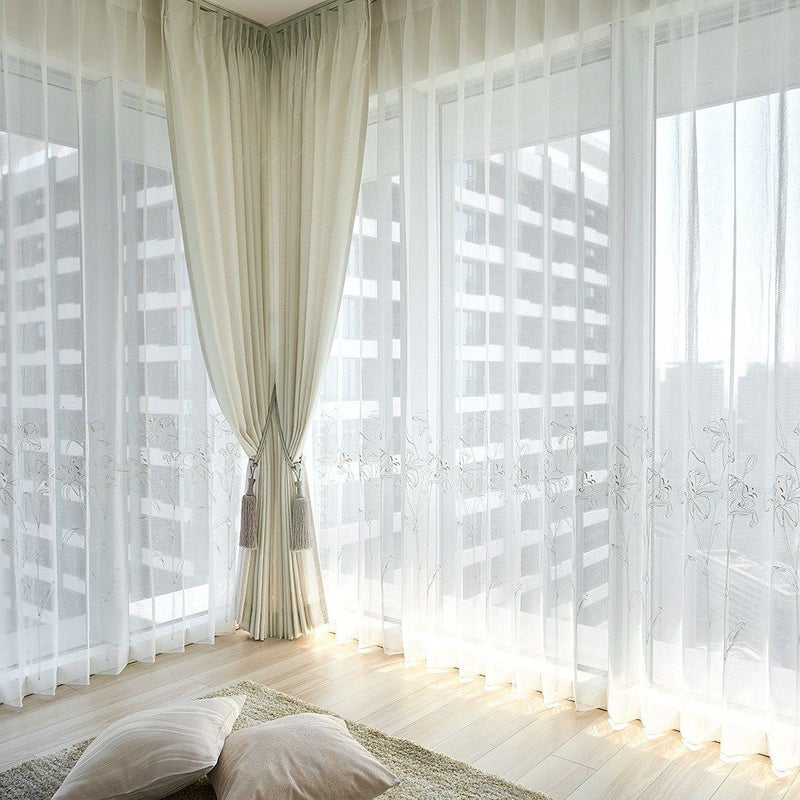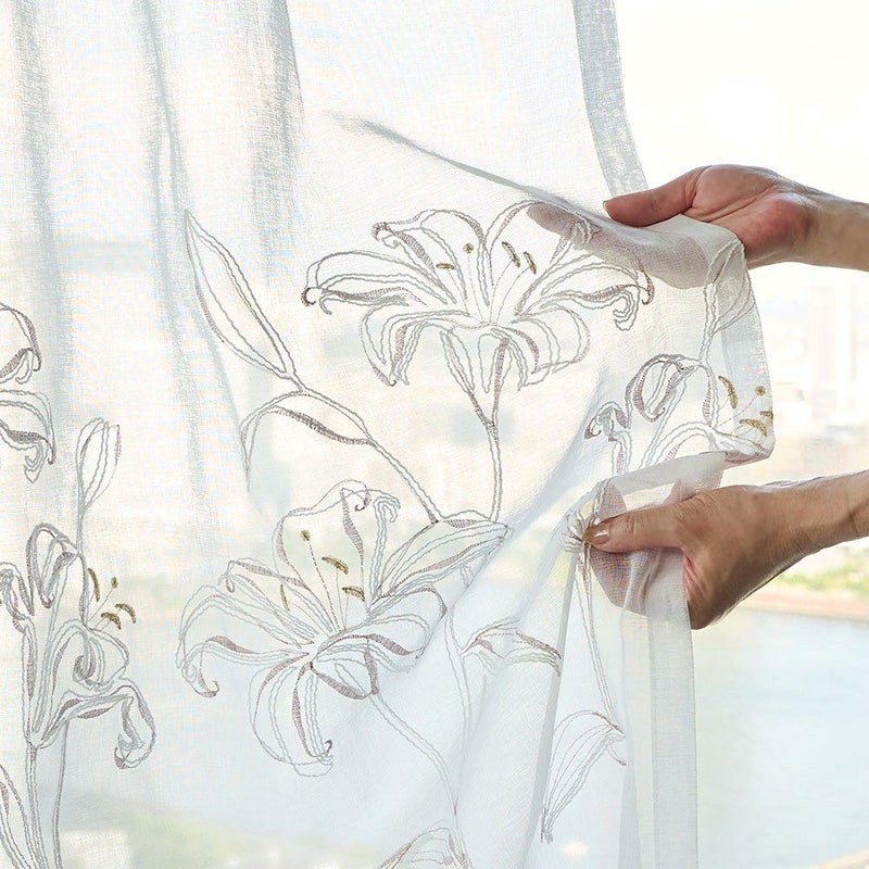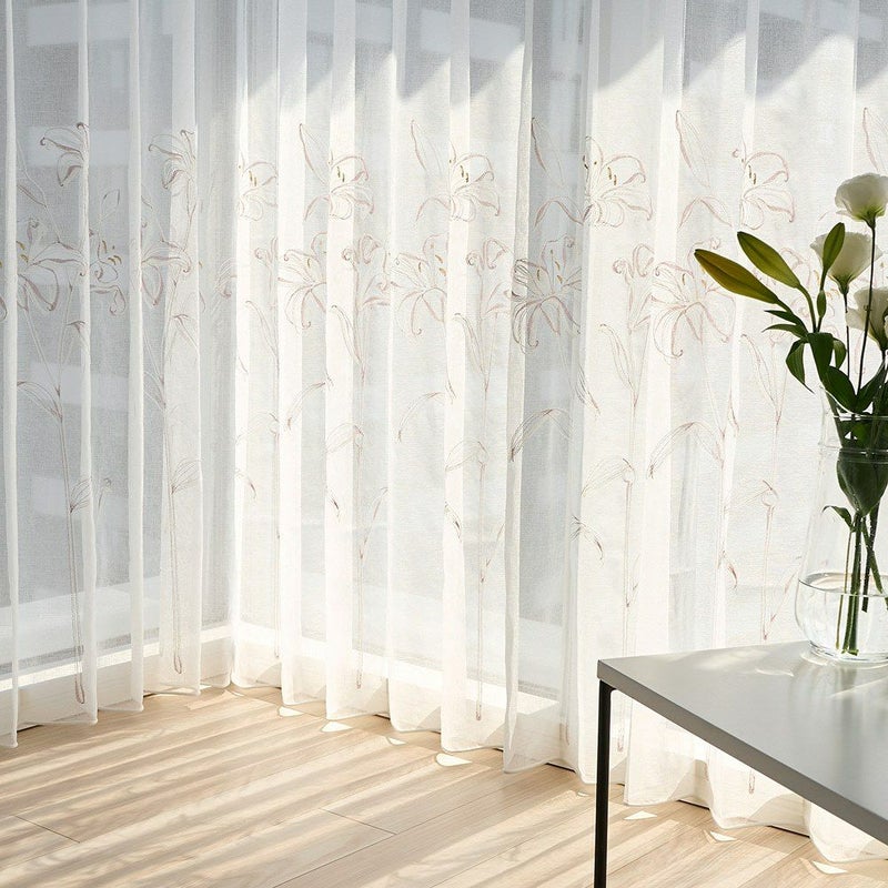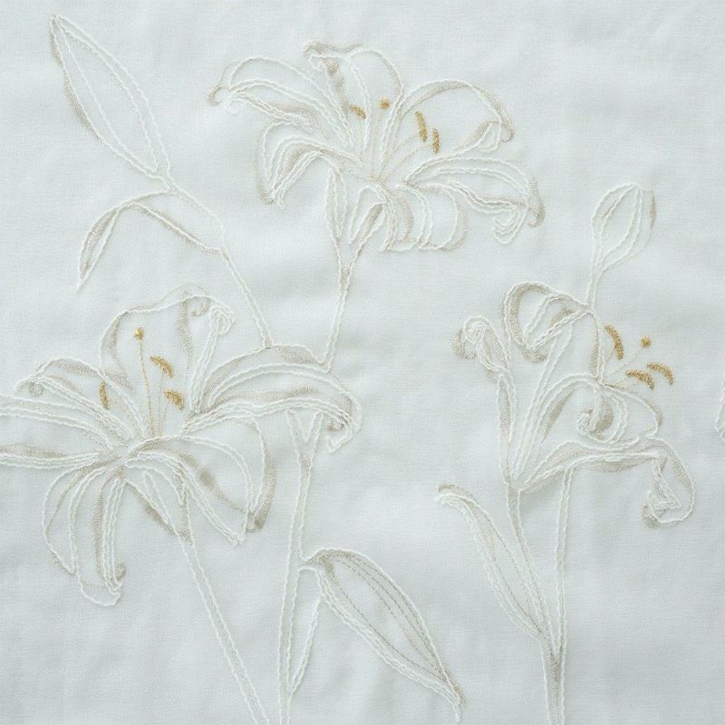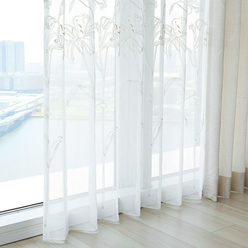 透ける光の中で咲くカサブランカの刺繍は、窓をフレームにした一枚のアートのよう。 裾を少し長めにとり、床にそっとたゆたわせる“ブレイクスタイル”で飾れば、 レースの揺らぎがより豊かに映り、空間に透明感と奥行きを与えます。 凛とした静寂とやわらかな光が調和し、空間を上質に整える一枚。