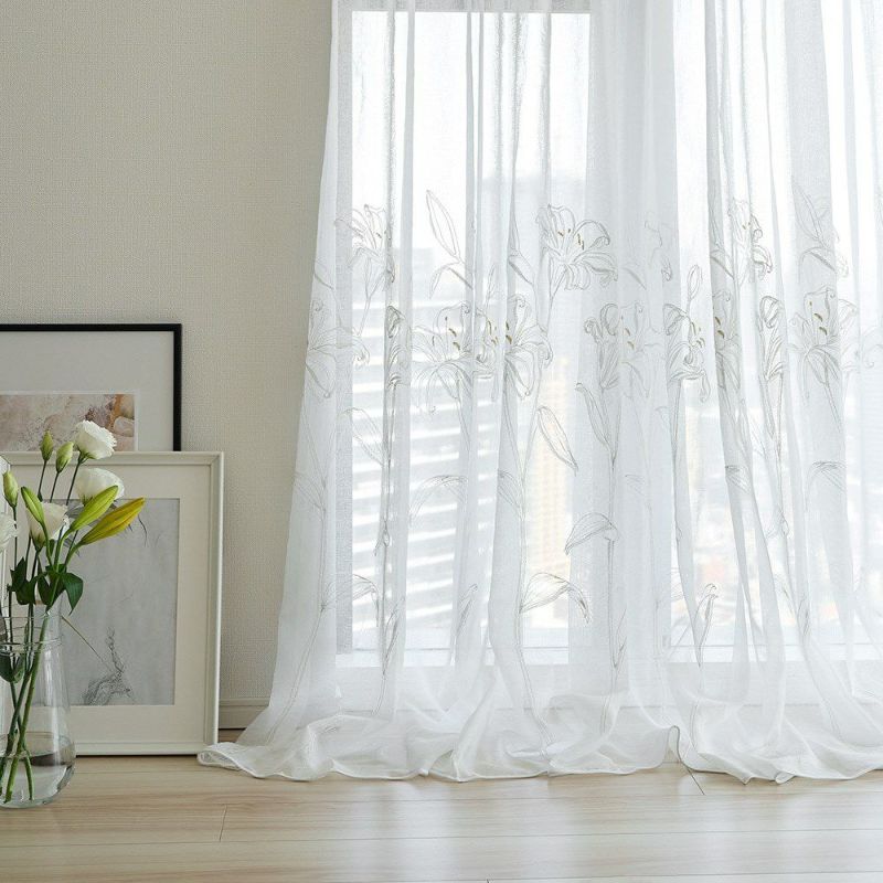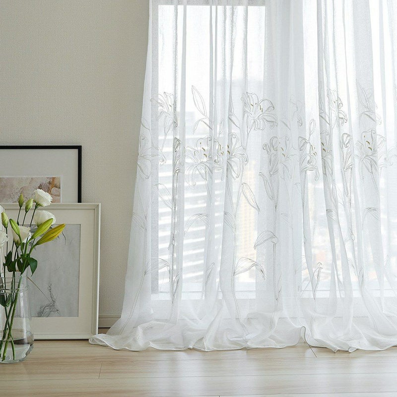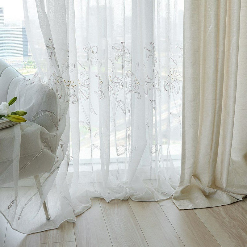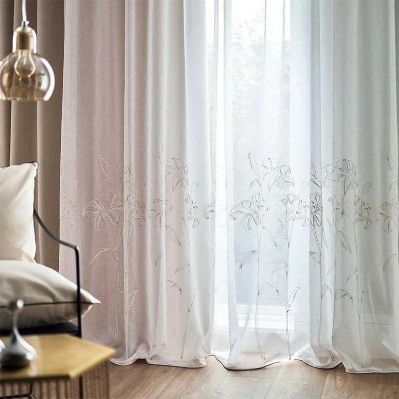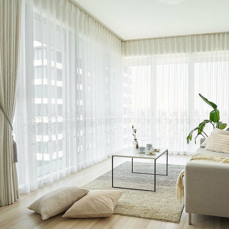 透ける光の中で咲くカサブランカの刺繍は、窓をフレームにした一枚のアートのよう。 裾を少し長めにとり、床にそっとたゆたわせる“ブレイクスタイル”で飾れば、 レースの揺らぎがより豊かに映り、空間に透明感と奥行きを与えます。 凛とした静寂とやわらかな光が調和し、空間を上質に整える一枚。