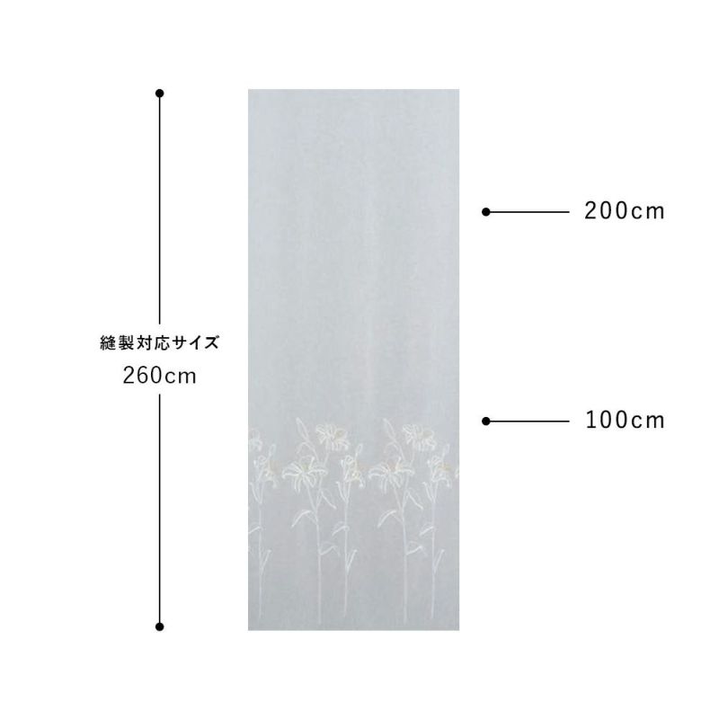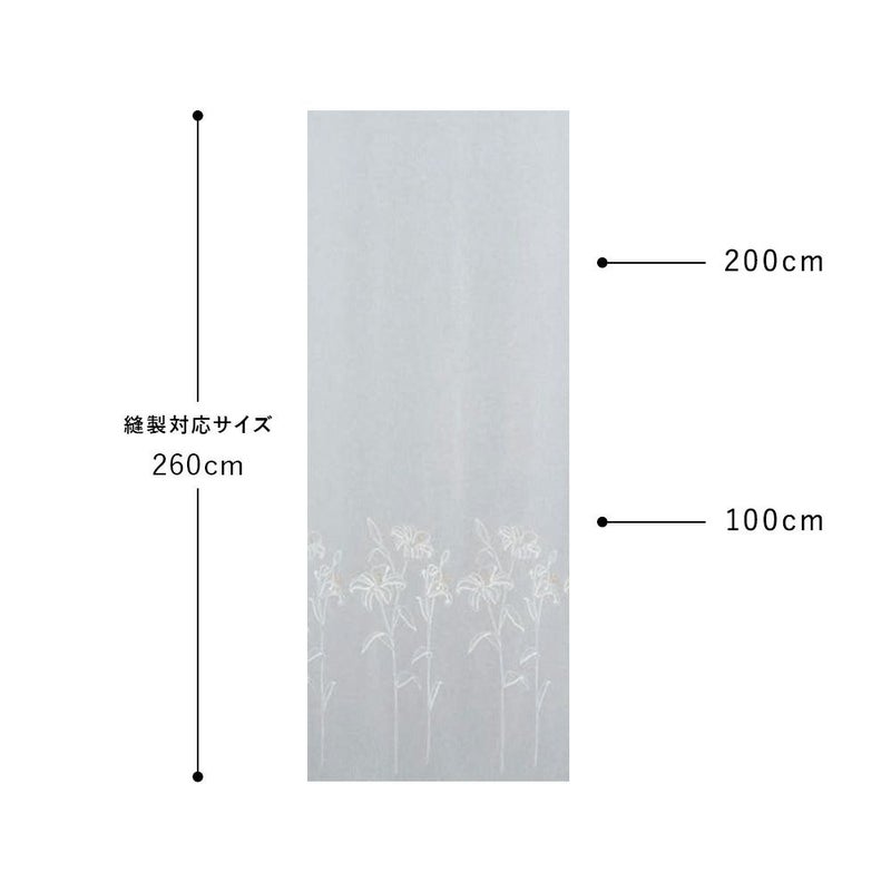 ボトム部分にたっぷりと刺繍を施し、トップは無地で抜け感のある仕上がりに。窓にバランスよく飾るには、高さ120cm以上のサイズでオーダーするのがおすすめです。295cm巾の大きなレース生地を使用しているため、大きな窓にほど好相性。最大作成丈は260cmです。