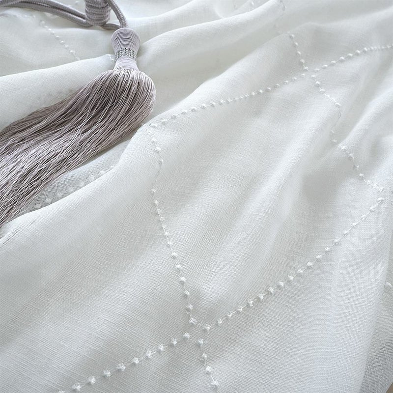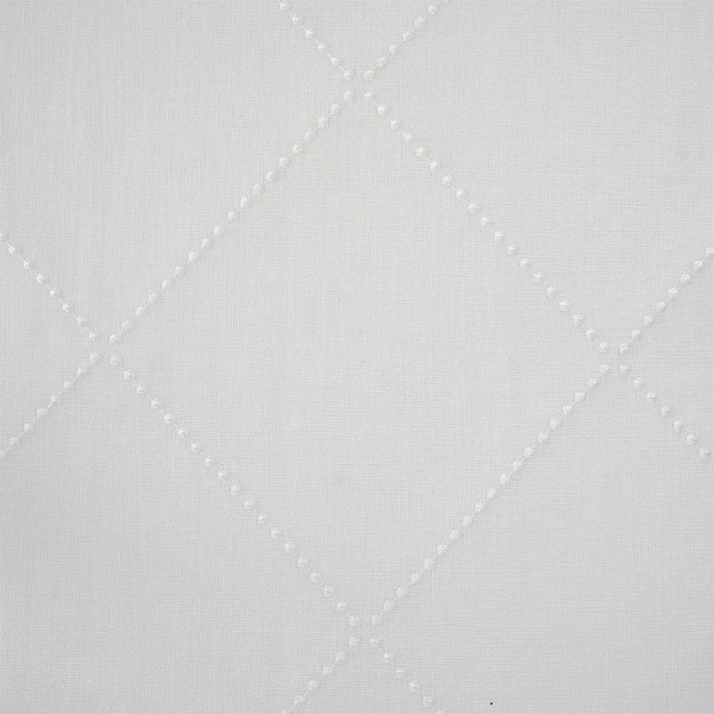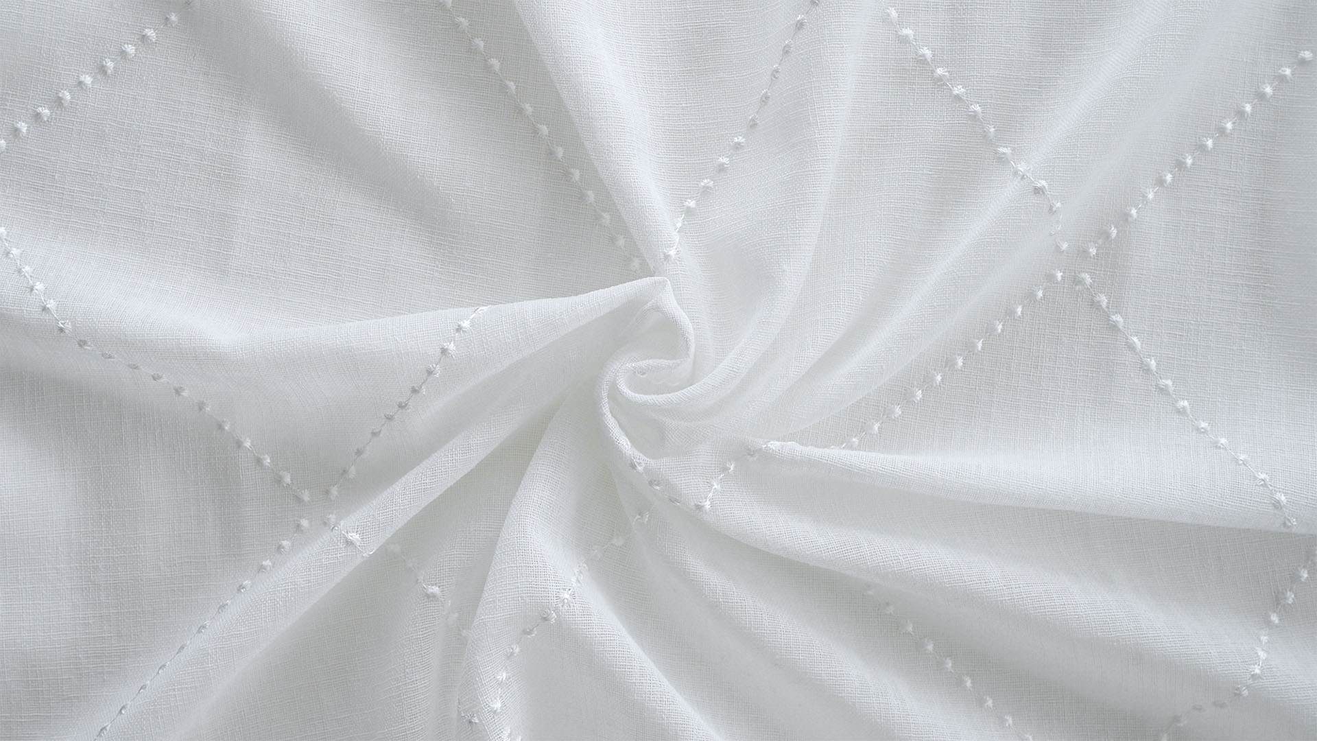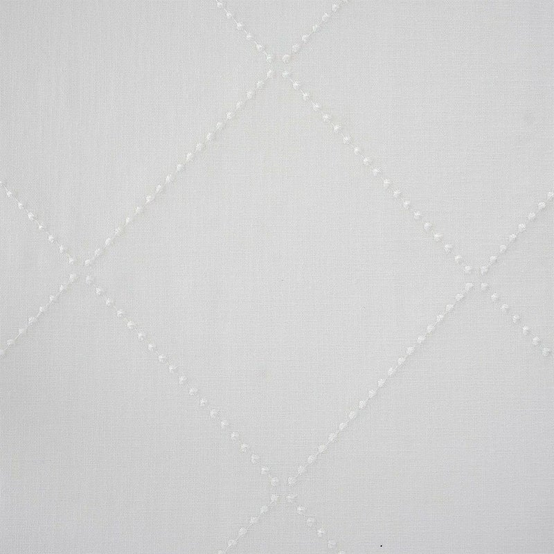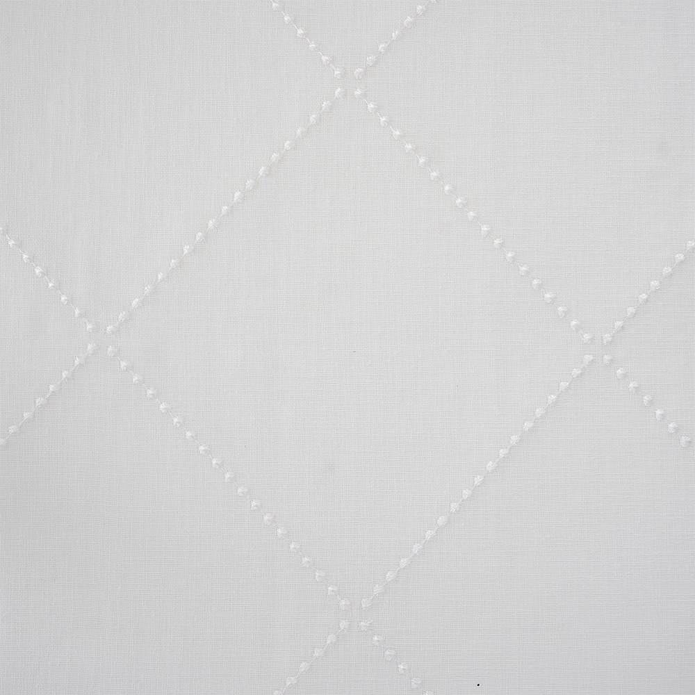 ひとつひとつ、ドット刺繍を丁寧に連ねて描かれたダイヤ柄。シンプルな無地でありながら、繊細な刺繍技術による立体感が、窓辺に奥行きを添える。控えめな中に美意識が光り、日常の空間に洗練さを纏うデザイン。