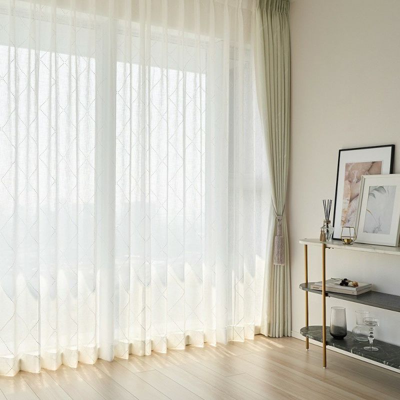 織り感のあるナチュラルな風合いに、立体的なドット刺繍でダイヤ柄を描いた上質なレースカーテン。柔らかな透け感が窓辺に清らかな気配を運び、シンプルでありながらも洗練されたエレガントさを演出する。オーダーカーテンならではの美しい仕立てで、日常の風景を上質な空間へと引き立てる一枚です。