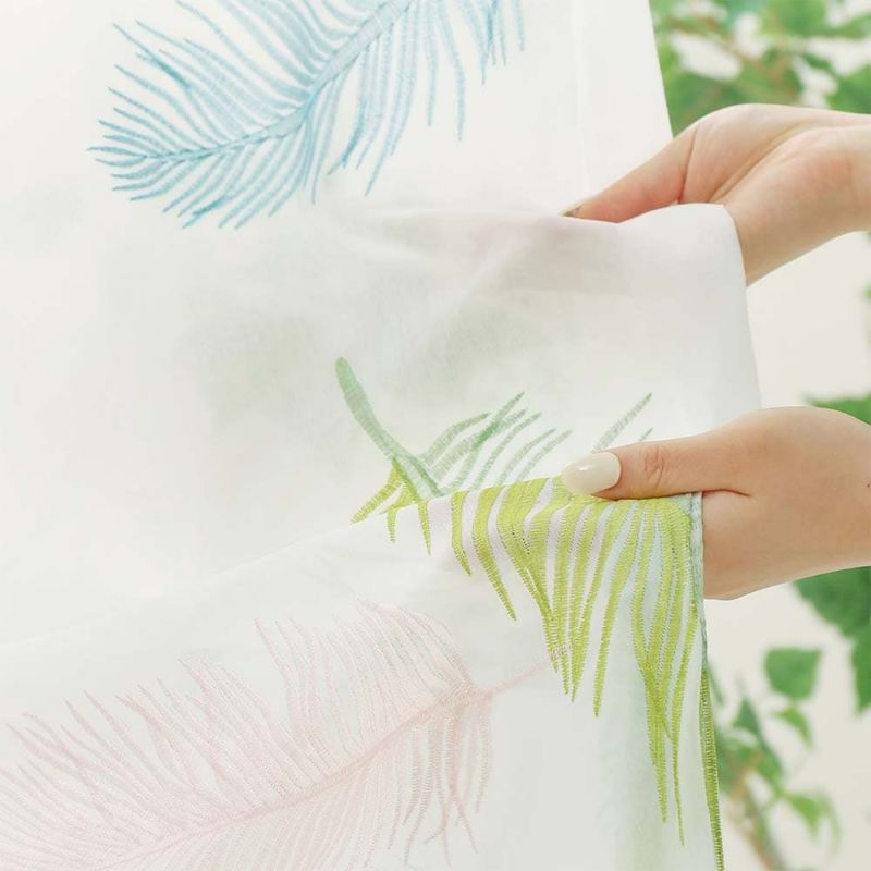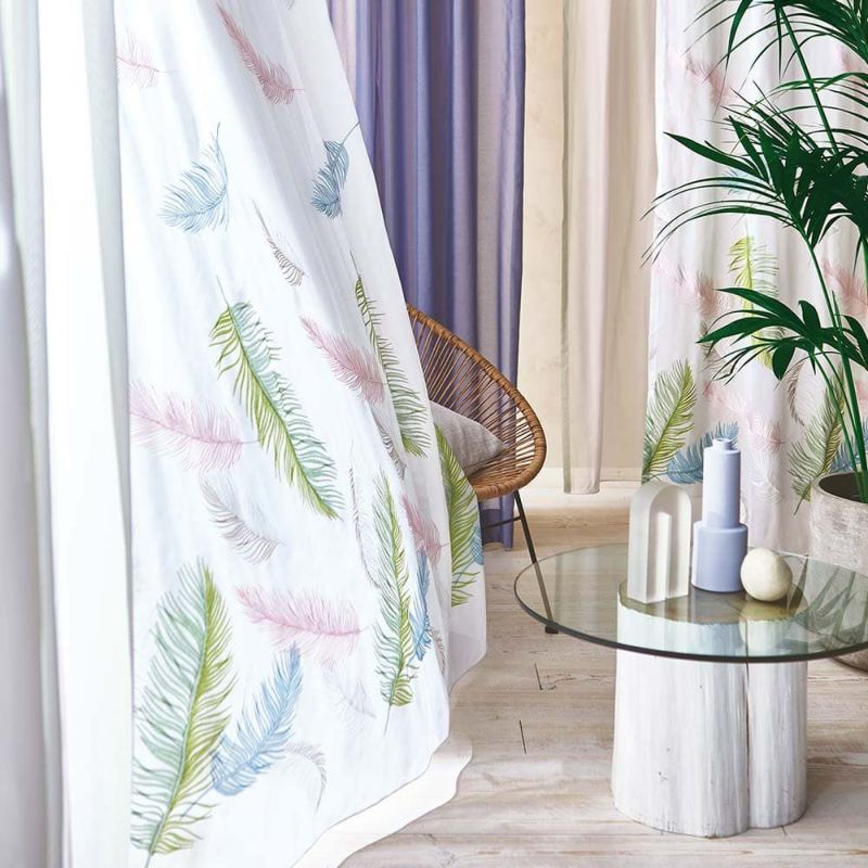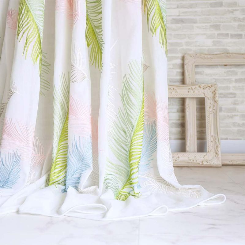 【撮影コーディネート】 ドレープカーテン <ザント ベージュ>/2倍ヒダ(3つ山)ふわり、ふわりと空から舞い落ちるカラフルな羽根。なんとも美しい光景をレースカーテンに落とし込みました。まるで楽園(パラディーゾ)のような空間をお楽しみいただける窓辺に貴方を誘います。