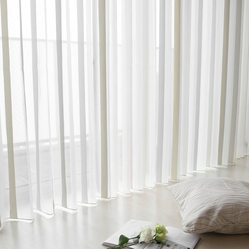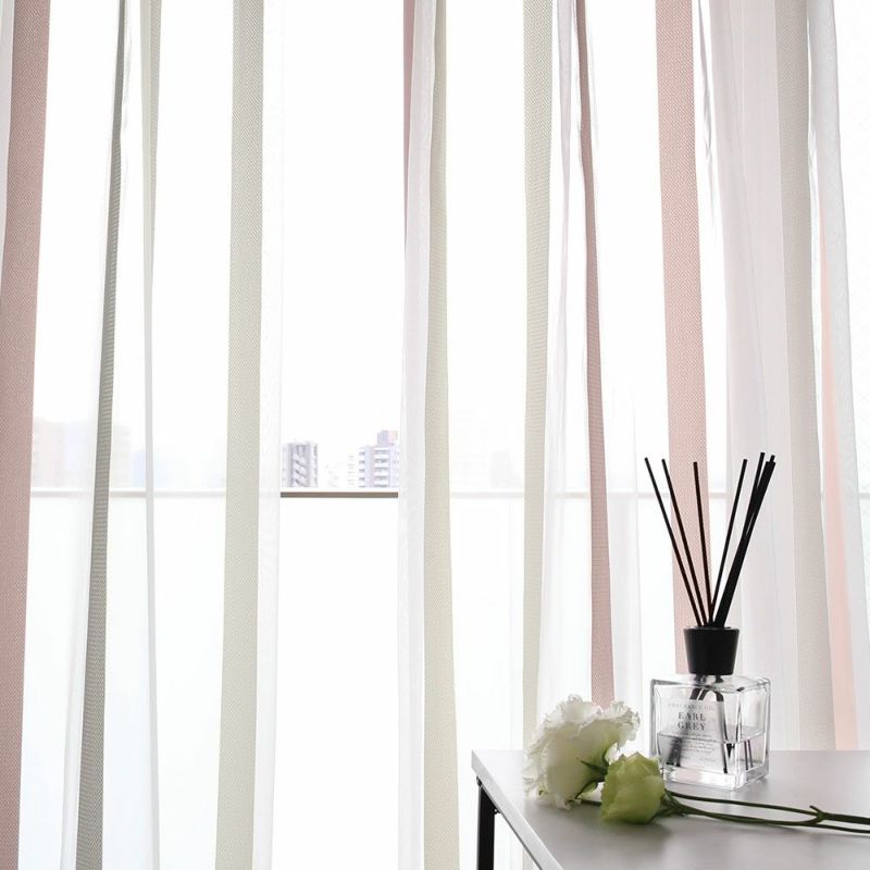 透け感と光沢感のコラボレーションを楽しむ、4色のカラーストライプデザイン。継ぎ目のないシームレス仕立てで、窓辺の景観をより一層美しく装います。 -