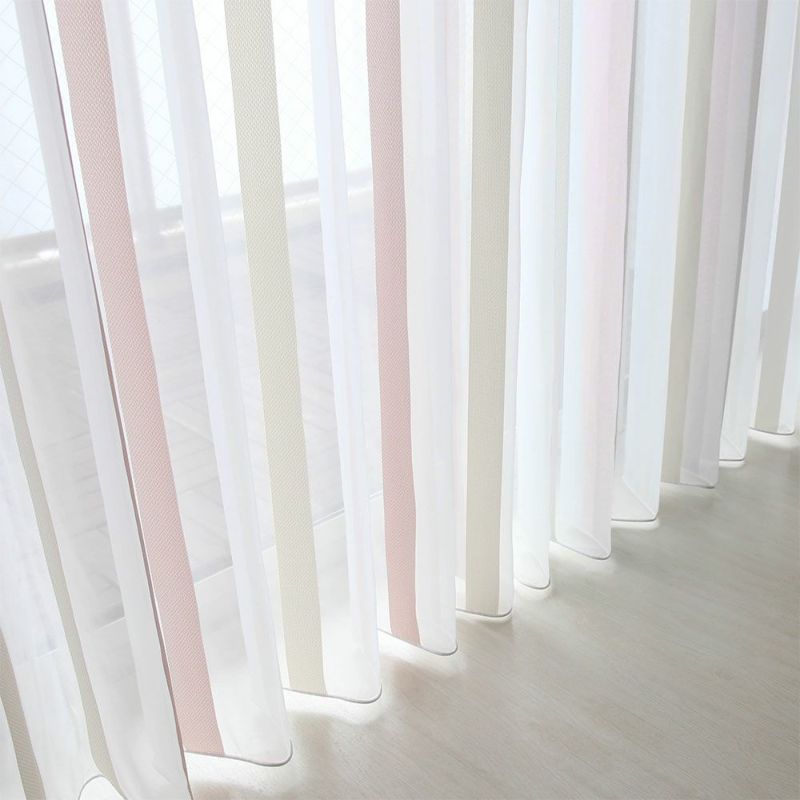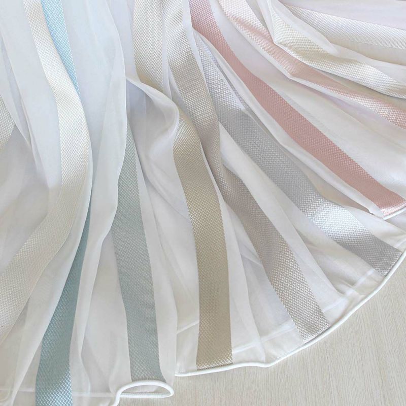 美しいストライプのグラデーションがリボンを纏ったように窓辺をドレスアップ。心地よいそよ風と、やわらかい陽ざしを浴びて、日中はレースカーテンで心地よくお過ごし頂けます。