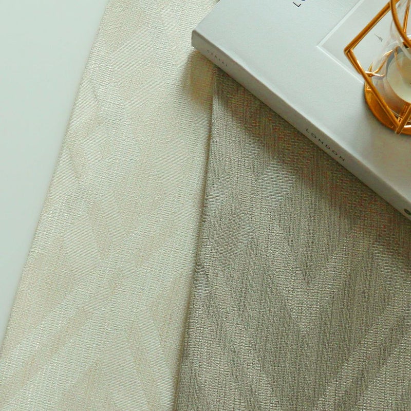 角度により重なったダイヤ柄が浮かび上がるデザインですが、陽射しが入ると、デザインは淡く溶けてまるで無地のように見える。そんな控えめで儚い雰囲気が、窓辺を上品に演出します。