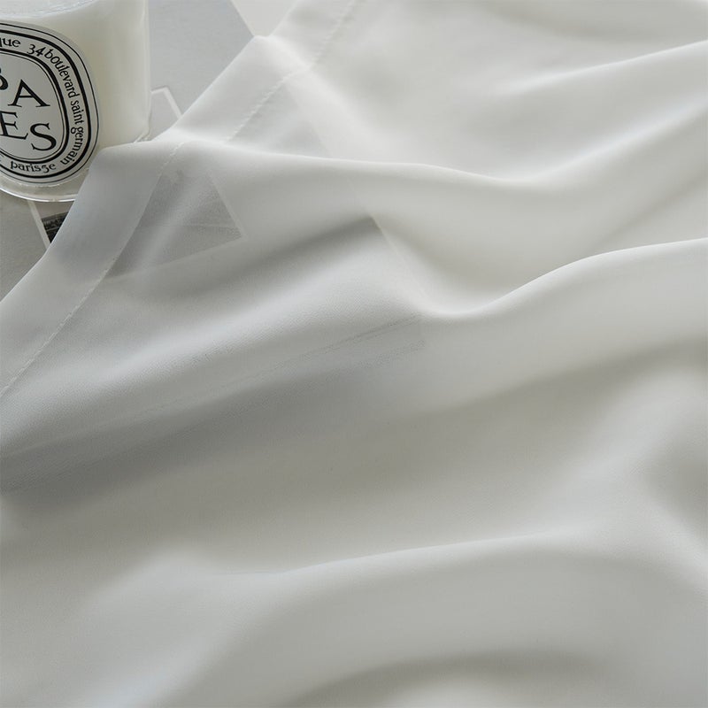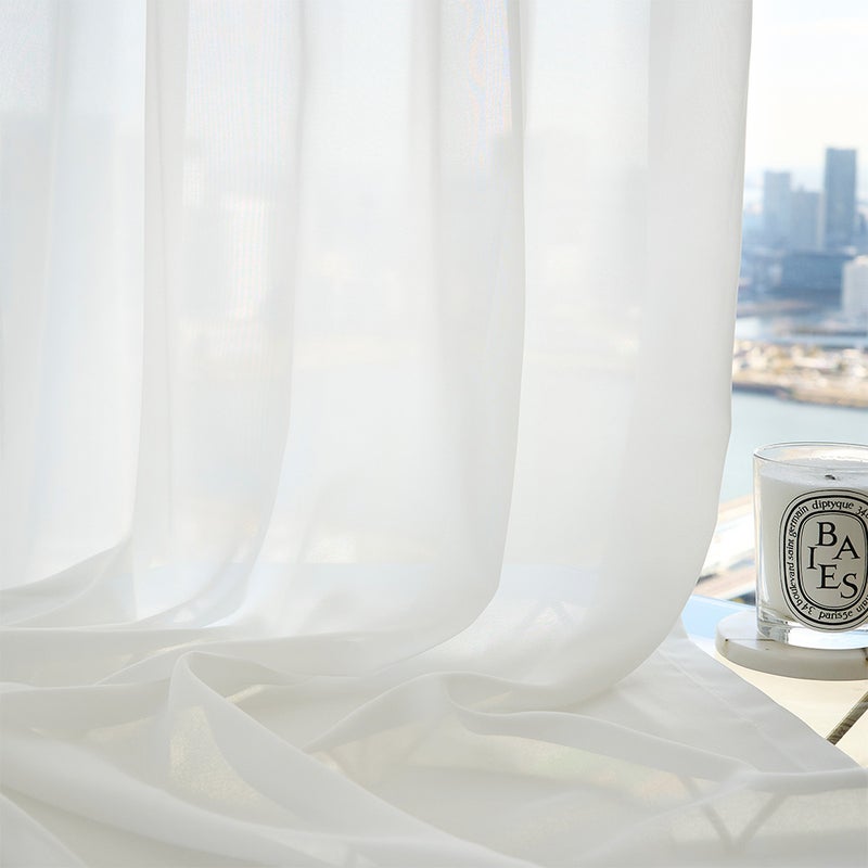近くで見るとよりはっきりと感じられる、キメ細やかなボイル生地の質感にもぜひ、注目してください。生地の質感は、触れ心地だけでなく見た目の雰囲気にも関わってくる大切な要素のひとつ。オーダーカーテンを選ぶなら、ぜひ一度手に取って確かめてみていただきたいポイントです。生地サンプルを無料でお届けするサービスも行っておりますので、ご活用ください。サンプル請求はこちらから。