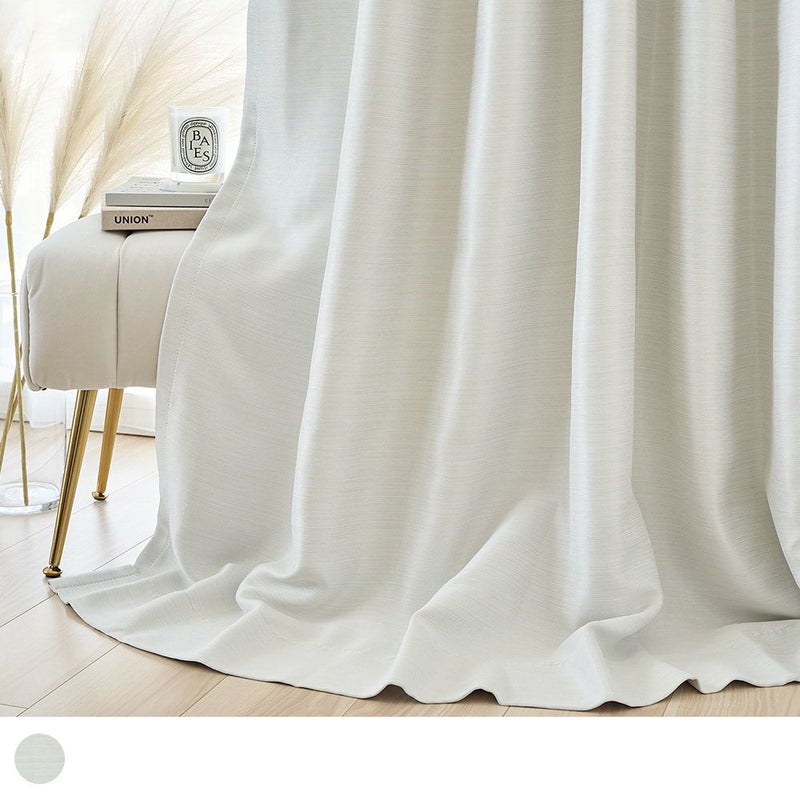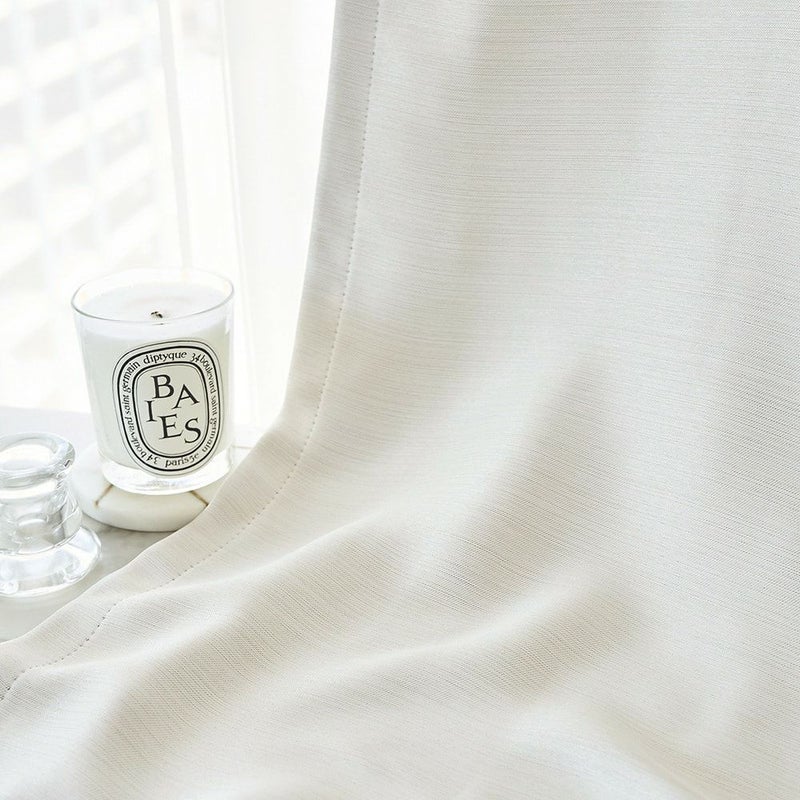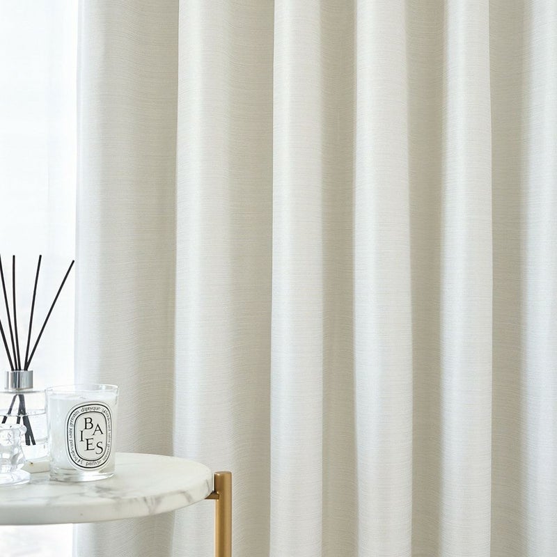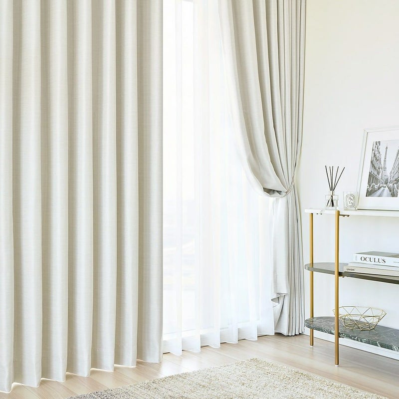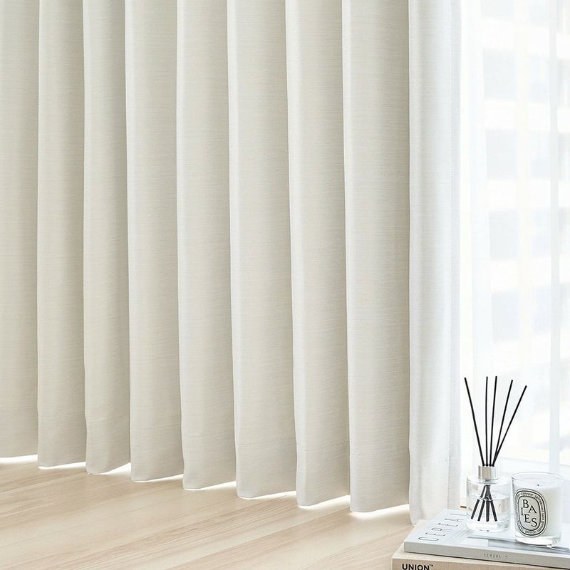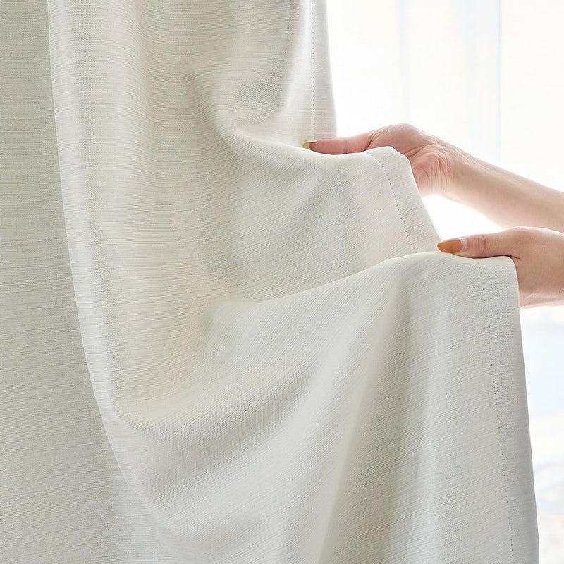 ほんのり艶めく女性らしい光沢感。この艶感が、お部屋に高級感と清潔感をプラスしてくれます。そして、シャンタン調の上品な節感が、白い遮光カーテンでものっぺりとしない抜け感のある雰囲気に仕上げます。