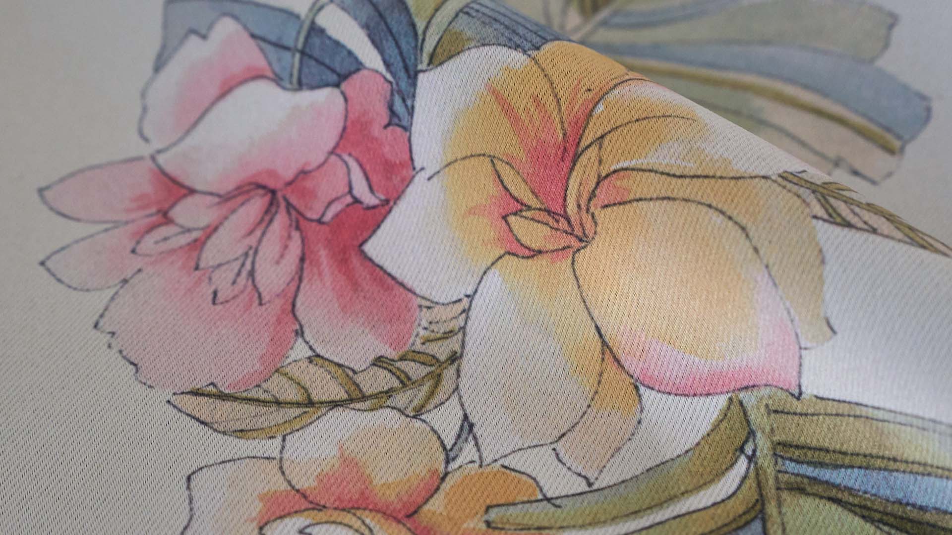 南国の花やリーフを描いたデザインなのに、すっと空間になじむのは、きっと色づかいがやさしいから。<ノア>は、派手になり過ぎないように何度も色を調整し、ナチュラルなトーンに仕上げました。お部屋に風が通るような軽やかなハワイの空気感を、毎日の暮らしに。