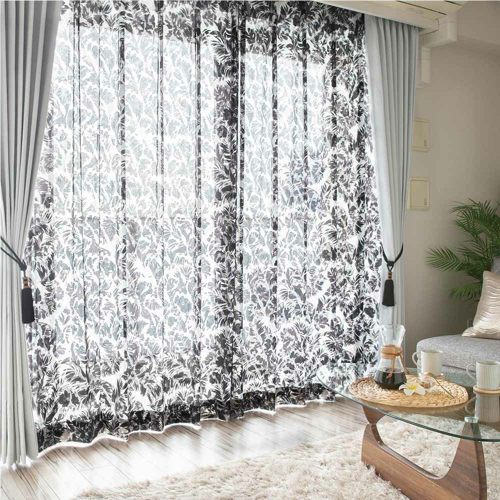 高級感のある家具や小物との相性がぴったりなこちらのカーテン。透け感があるからこそ、黒でも重い印象にならず、ふわっと明るい印象に導きます。上品なハワイアンデザインも重なり、これ1枚で高級感のあるお部屋に!