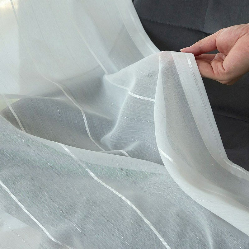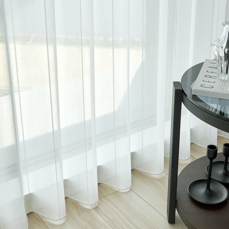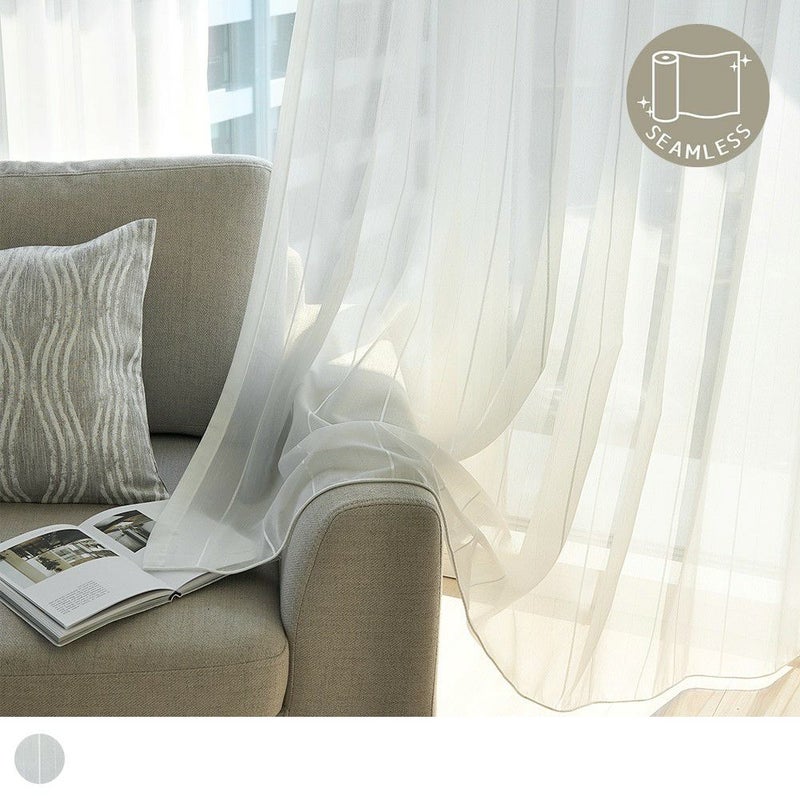 細いストライプ柄は、空間に高さと奥行きを演出する効果も。感性を研ぎ澄ませるようなシルバーの輝きが、窓辺の印象を引き締めるアクセントに。レースカーテンが揺れるたび、キラリと輝く凛とした表情を楽しんで。