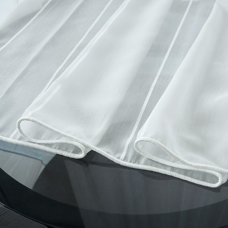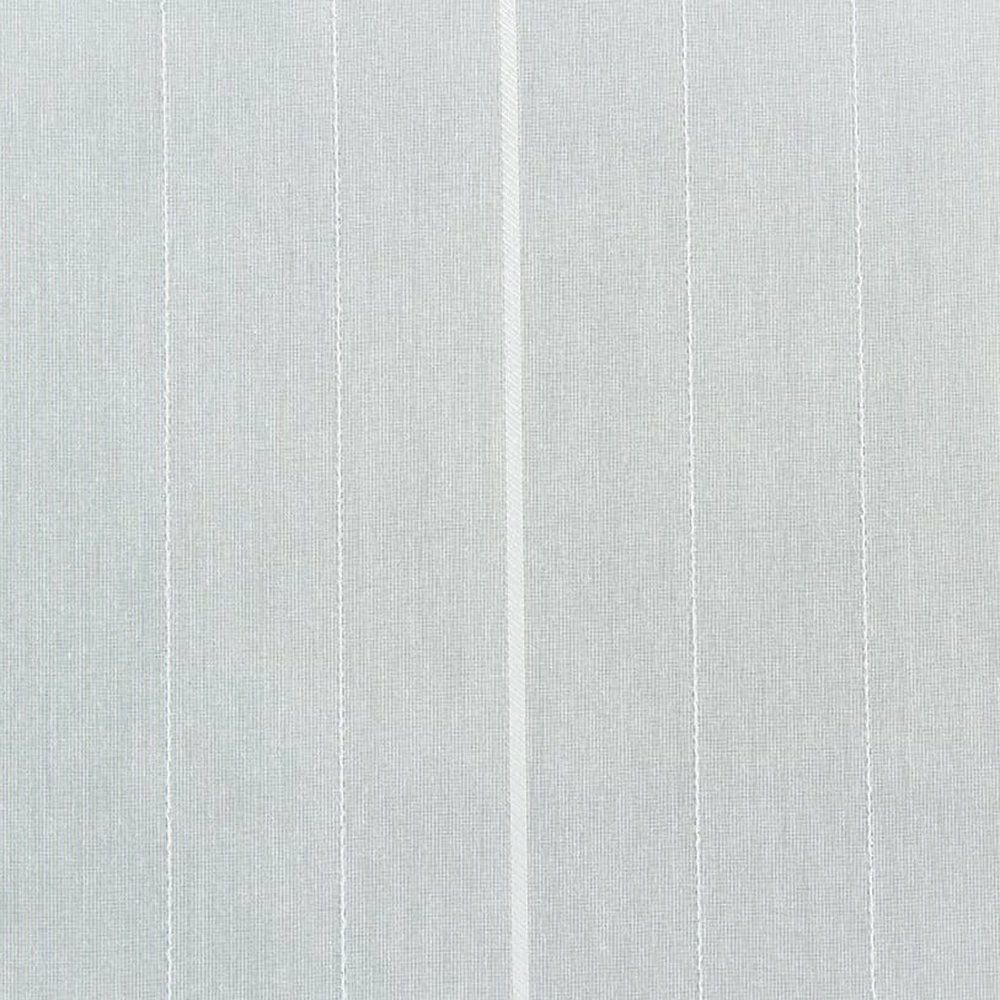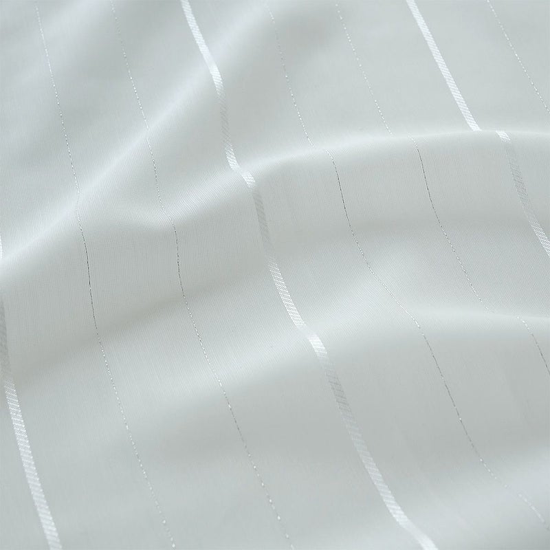 繊細な糸で織り上げられた、ほどよい透け感が魅力のボイル生地。縦に走らせたシルバーのラメ糸と、ホワイトの光沢糸が奏でるコントラスト。スタイリッシュな輝きを放つ、特別な一枚。