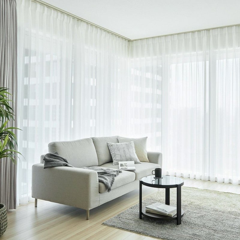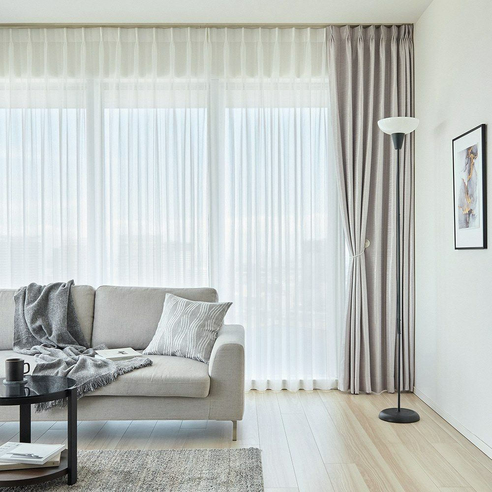 継ぎ目が一切入らない、美しい仕上がりの広窓仕様のレースカーテン。大きな窓を包み込むように広がるその佇まいは、空間に統一感をもたらします。開放的な窓辺で、心ほどける日常を。
