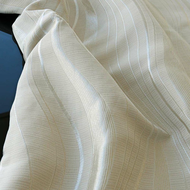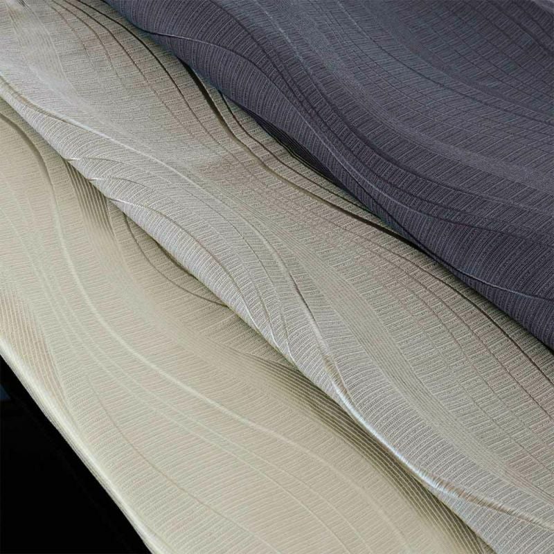 穏やかで緩やかなウェーブ。流れ落ちる水のようなライン。柔らかな光の時は無地に近い、おとなしい表情を見せるが、光が当たると美しくデザインが浮かび上がる。その時々によって見せる表情を楽しめるのはジャガード織のカーテンならでは。