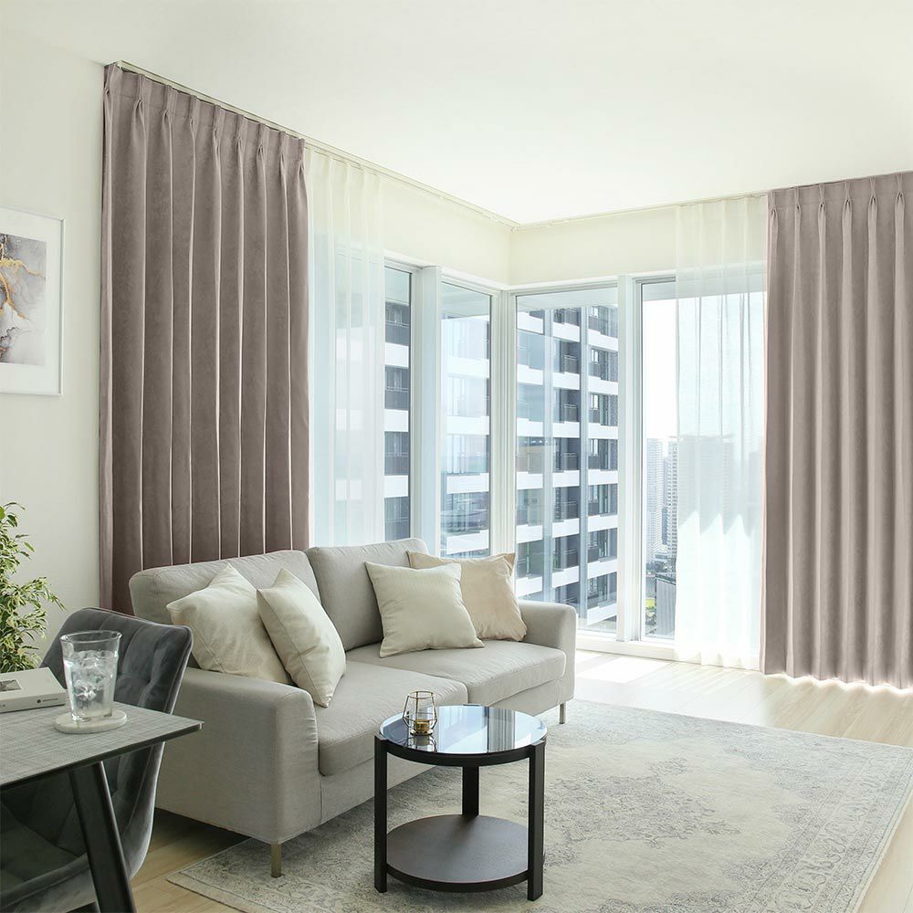 美しい見た目だけでなく、遮光性にも妥協しないオーダーカーテン。淡い色のパールグレーやライトベージュも2級遮光をクリアし、ほとんどのカラーで1級遮光を実現しました。強い日差しをしっかりと遮り、心地よいプライベート空間をつくります。