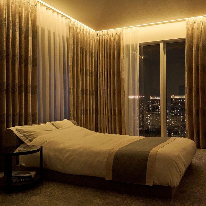 昼の自然光とは異なり、夜は間接照明のやわらかな灯りがカーテンの表情を深める。光沢糸の艶がほのかに煌めき、凹凸がつくる陰影が奥行きのあるムードを描き出す。外に広がる夜景と、室内に落ちるあたたかな光。その境界に佇むカーテンは、外と内をやさしく繋ぎながら、大人のための寛ぎの時間をより深く、より豊かに整えていきます。