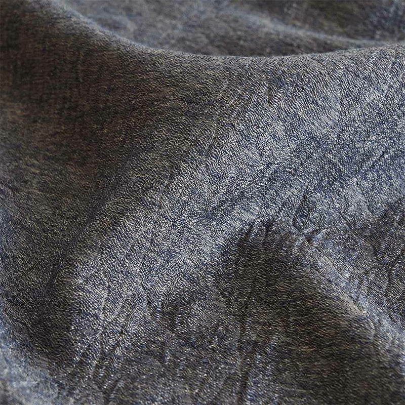 緻密に設計された織り組織と収縮糸のバランスによって、柄とテクスチャーを両立したファブリック。織り密度の差が繊細な凹凸を生み、光を受ける角度で小紋柄の陰影が浮かび上がります。ジャガード織りならではの立体感と、糸の収縮による絶妙なニュアンスが重なり合い、“静かな贅沢”を纏う一枚に。