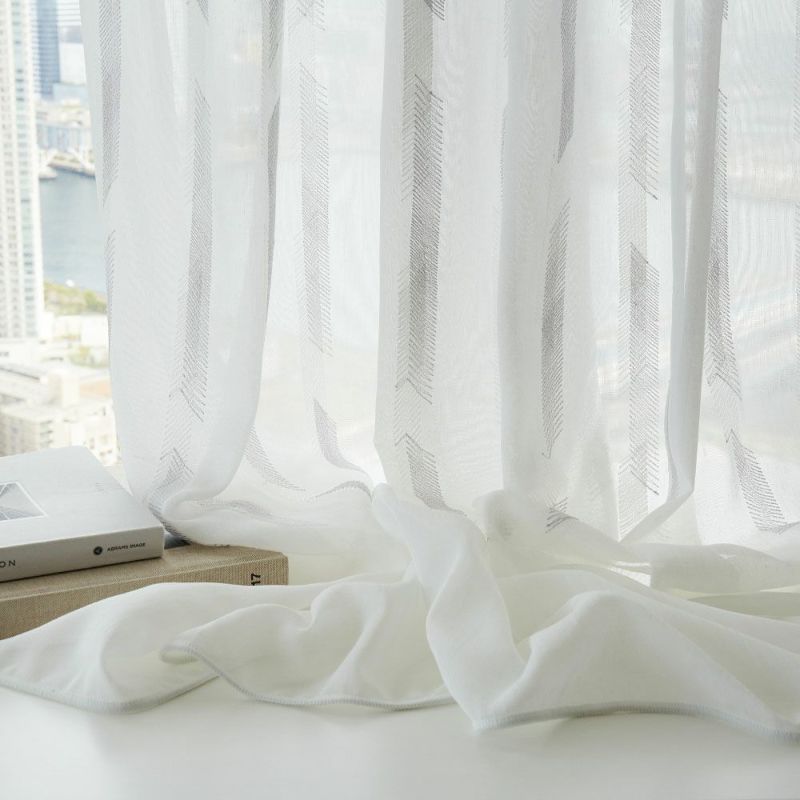 グラデーションのように、刺繍の密度を変化させて描いた、繊細なデザイン。折り重なるようにストライプを配置させ、窓越しに美しい陰影を映し出します。