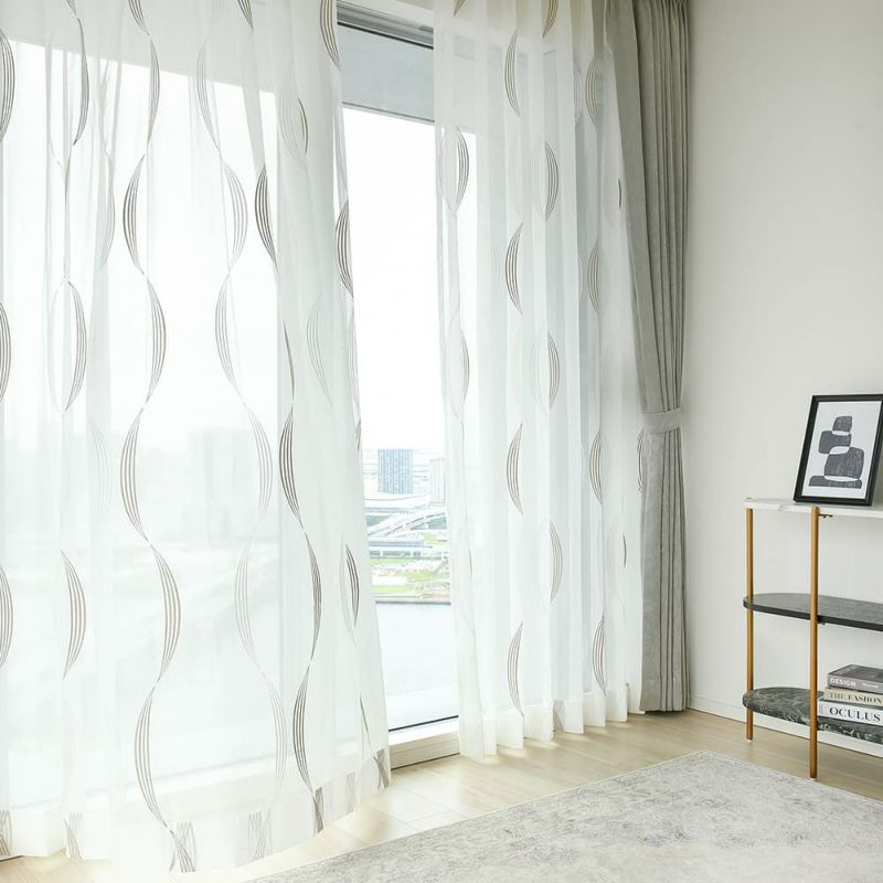 一定のリズムで流れる波模様が忙しない毎日にふと、気持ちを落ち着かせるタイミングを与えてくれる。都会的で上品な刺繍は美しく、心に癒しを与えてくれる。さぁ、リラクシーなレースカーテンで過ごす、アーバンライフを楽しもう。 -