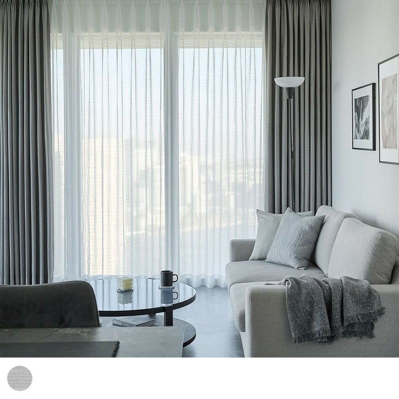 外の景色を淡くとらえながら、視線はやさしくぼかすちょうどいい透け感。 無地でありながら単調にならないのは、テクニカルな織りがもたらす上品な奥行き。ふと見上げると、生地の奥にあるわずかな光沢のムラがほのかに浮かび、景色を薄いヴェールで包み込むような光景に。透けすぎない安心感と、開放感のバランスが程よい、洗練されたレースカーテン。