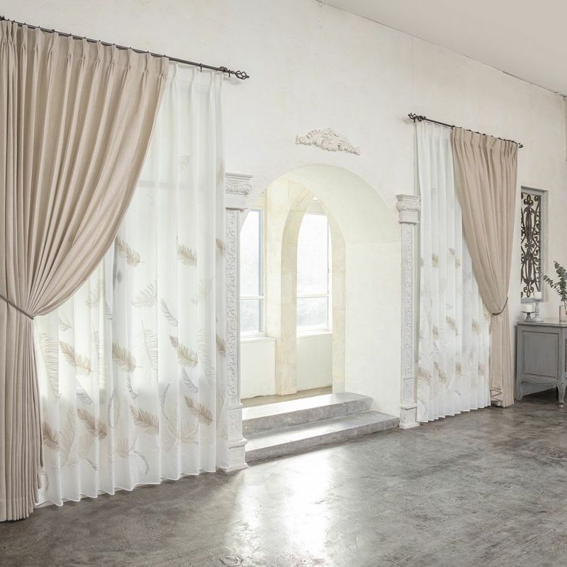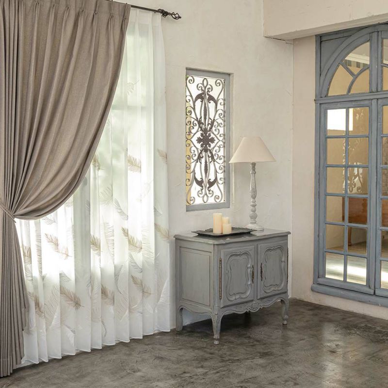 ドレープカーテンをシンプルにまとめた時は、レースカーテンで大胆に遊んでみては?ドレープに合わせて、シンプルなレースも素敵だけど、時にはとびきり大胆なコーディネートをしてみましょう。大きな羽根のような刺繍レースを合わせれば、より軽やかな窓辺を楽しめます。