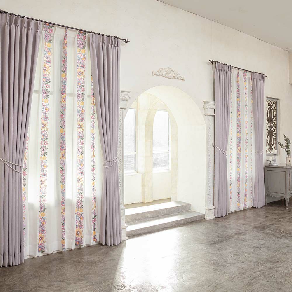 くすみカラーのカーテンとカラフルなレースを合わせる