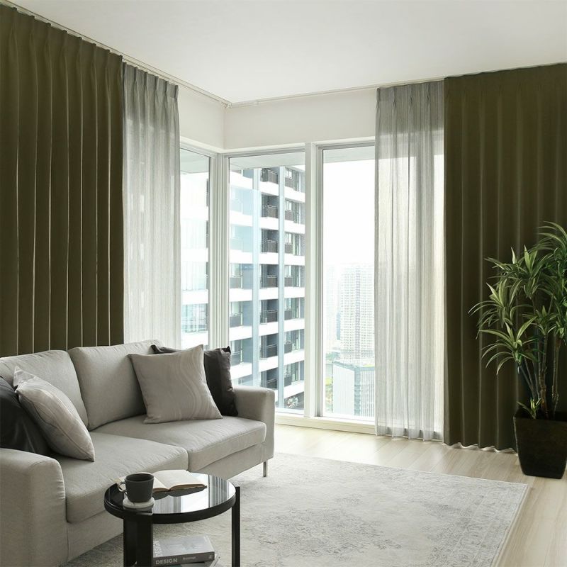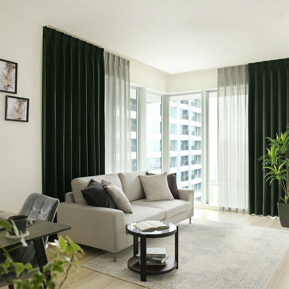 その空間が格好いい印象になるかどうかは、カーテンの色の明度や彩度に大きく左右される。シックとモダンさを持ったこのアイテムなら、ぐっと都会的な大人の空間へ引き締めてくれる。