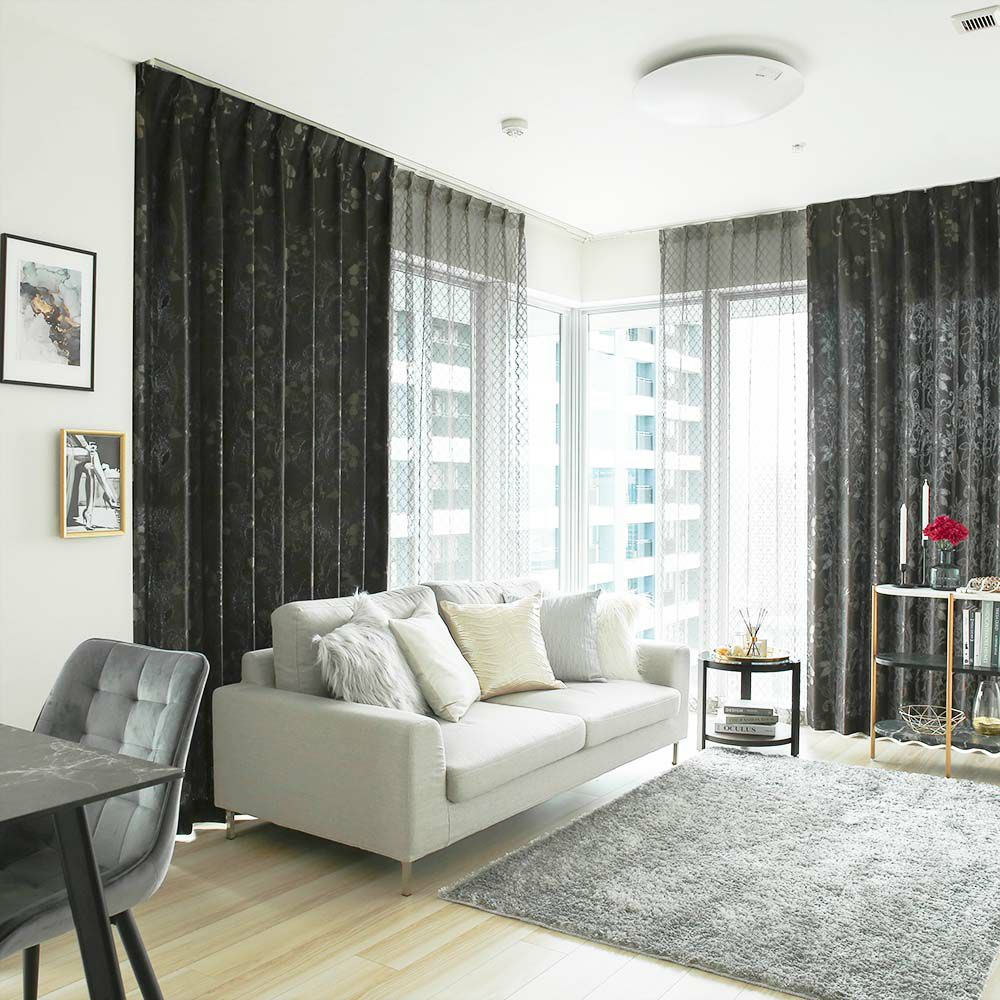 ラグジュアリーなインテリアとの相性が良く、このカーテンをかけることでより華やかな空間に。ブラックでしっかりと空間を締めてくれて、バランス良く仕上げてくれる。
