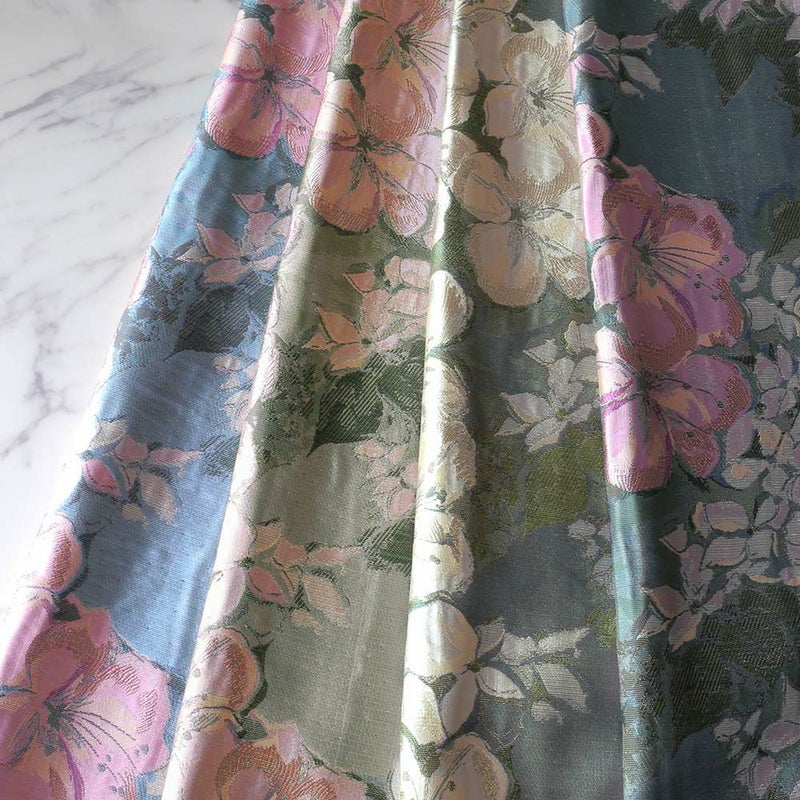華やかなツツジは刺繍のような華やかさを、対してヤマボウシはつつましく奥ゆかしい表情を出すために織の表現に。繊細な国産ジャガード織ならではの美しいコントラストをお楽しみいただけます。 -