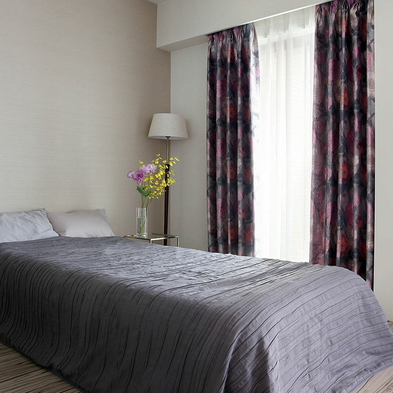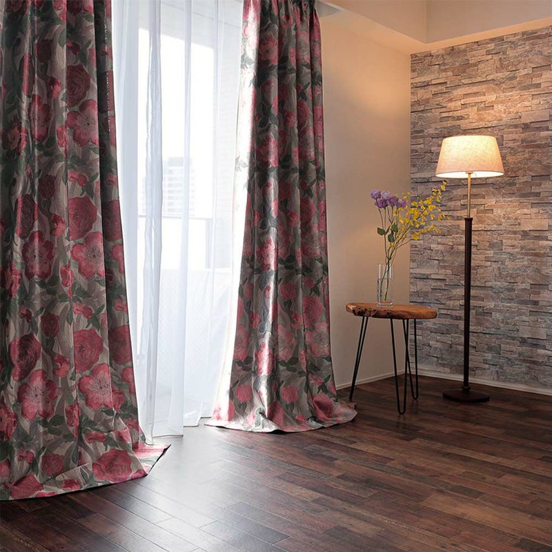 美しい風景を一層引き立てる。魅力的なカーテンにはそんな力があります。日々の疲れを癒す寝室の窓には、上品で豪華なカーテンがおすすめです。柔らかでシルクのような光沢と、気分を高揚させてくれる美しいデザインが目にも癒しを与えてくれる。美しい薔薇の花が朝日を反射し、まるで夢のような美しさに目を奪われることでしょう。