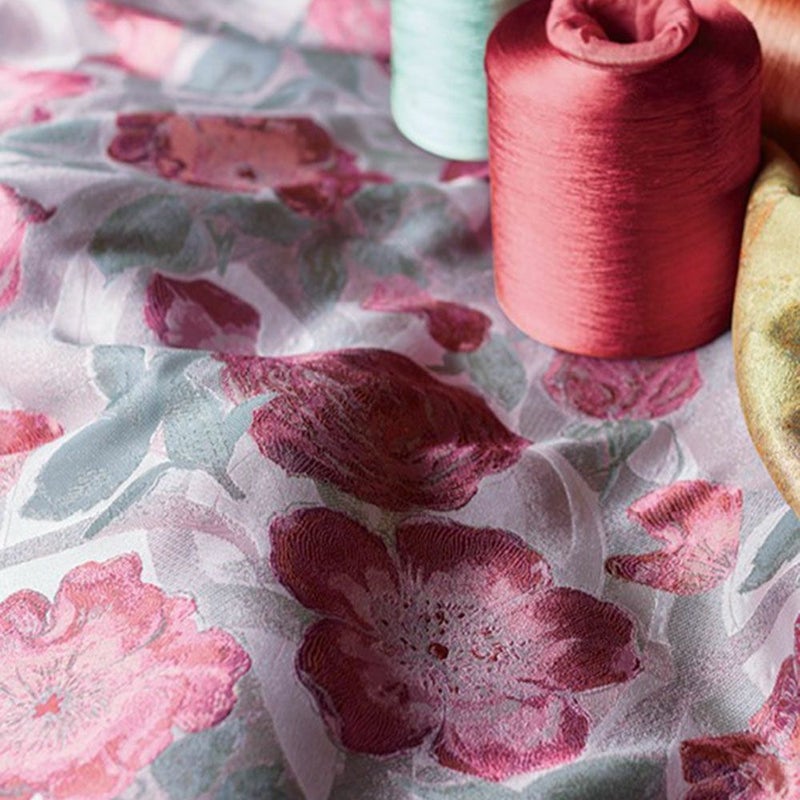 様々な薔薇が寄り添い、揺れ、たなびく。たっぷりと、ふくらみのある薔薇の花を、刺繍のように緻密なジャガード織で表現しました。。空気や水の流れの揺らぎを背景にデザインした、奥行きを感じさせるテキスタイルです。