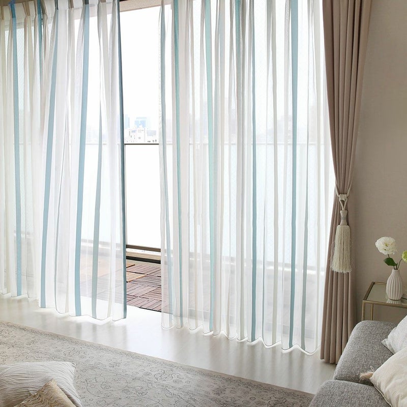 美しいストライプのグラデーションがリボンを纏ったように窓辺をドレスアップ。心地よいそよ風と、やわらかい陽ざしを浴びて、日中はレースカーテンで心地よくお過ごし頂けます。