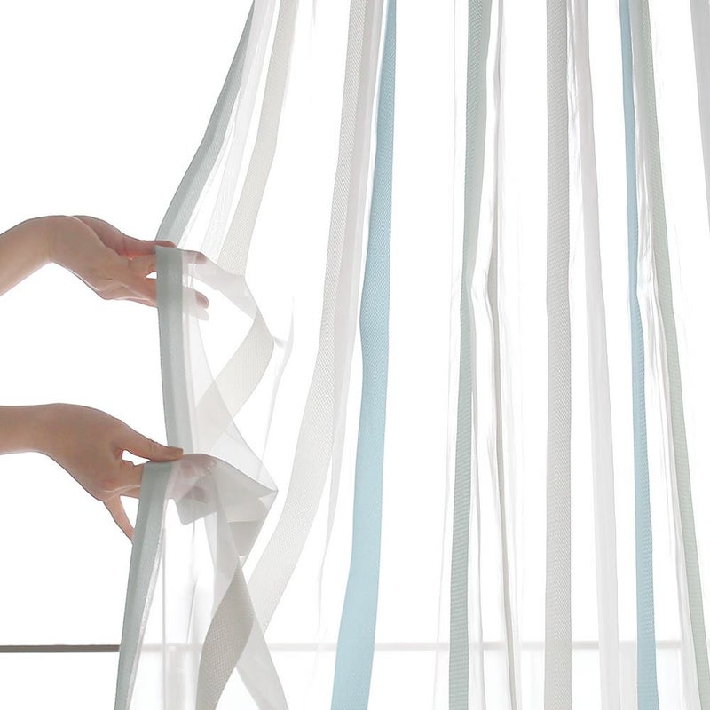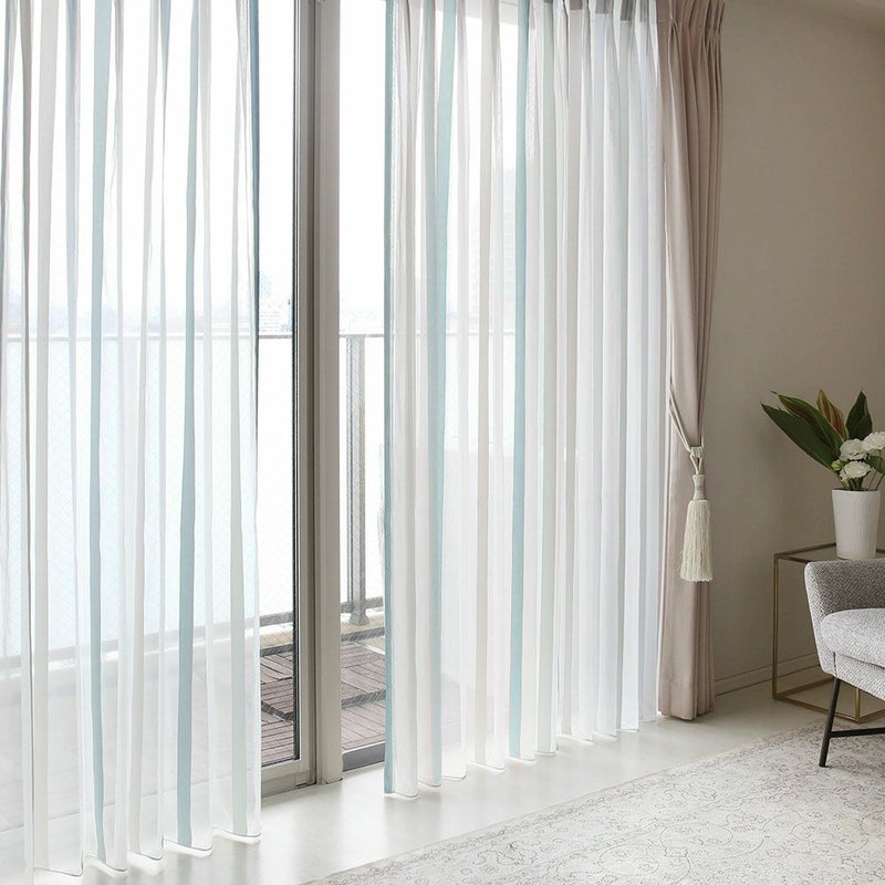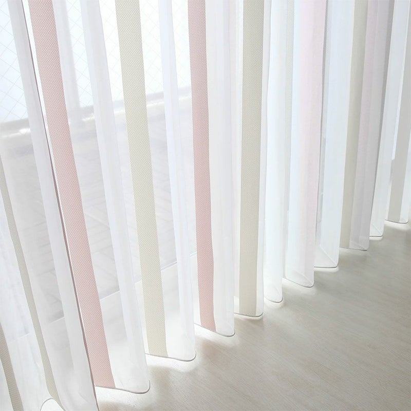 透け感と光沢感のコラボレーションを楽しむ、4色のカラーストライプデザイン。継ぎ目のないシームレス仕立てで、窓辺の景観をより一層美しく装います。 -