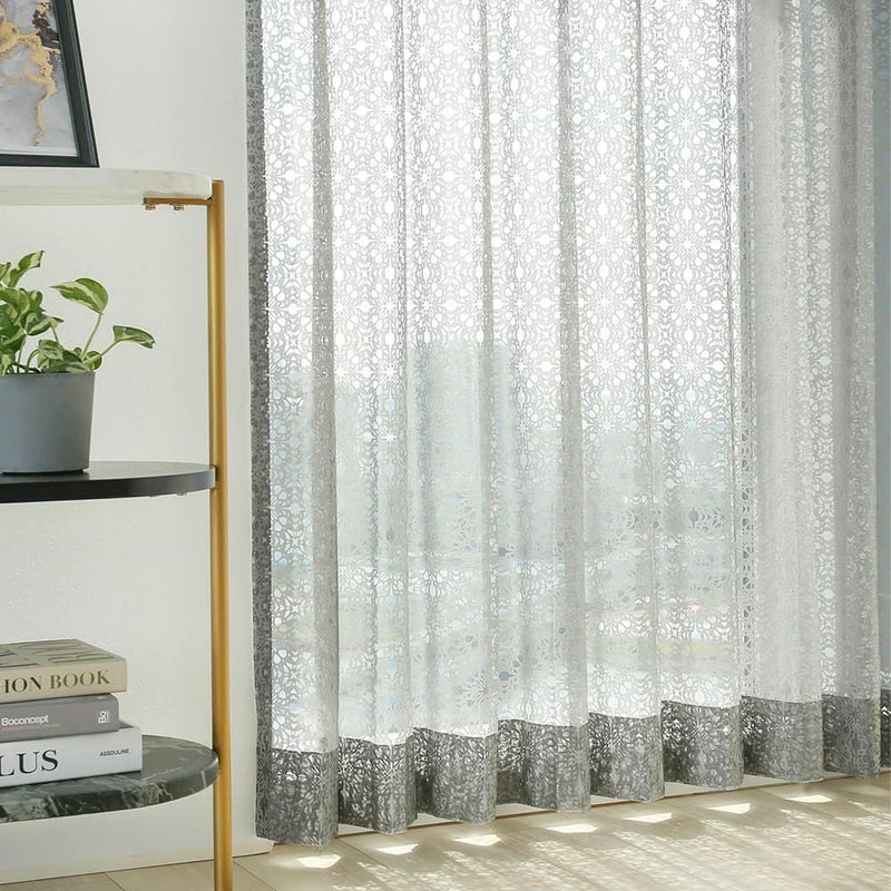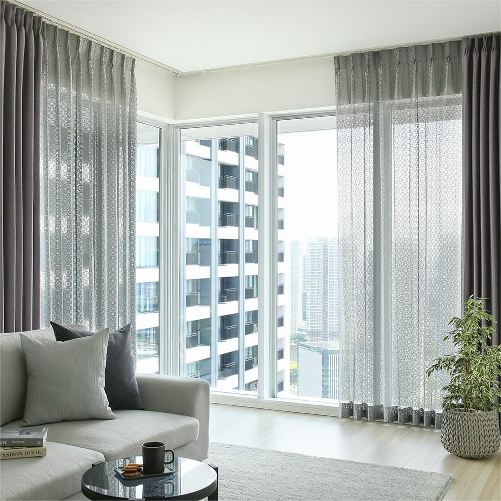 光が差し込むと、まるでアートのように柄が浮かび上がる。透け感のあるオパールレースにメタリックな艶を纏わせて、都会的で洗練された空間を演出します。凛とした佇まいと軽やかな素材感のコントラストが、印象的な窓辺を生み出します。