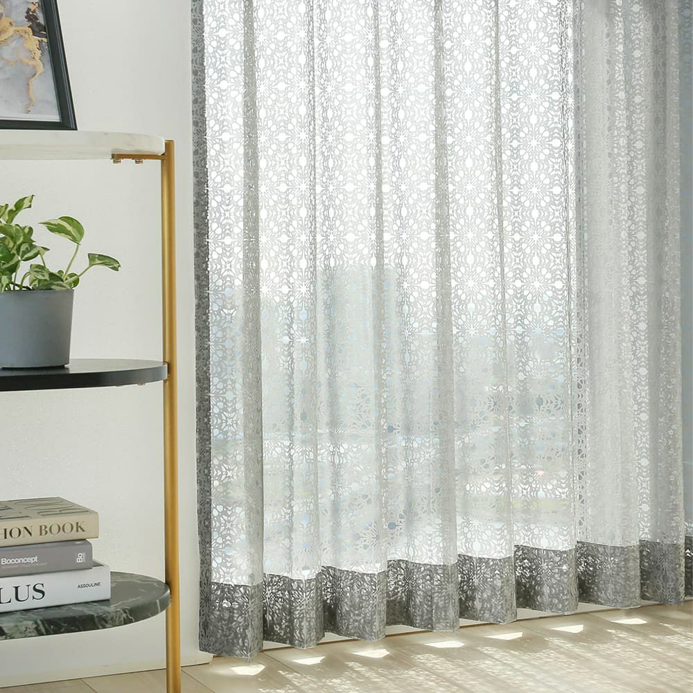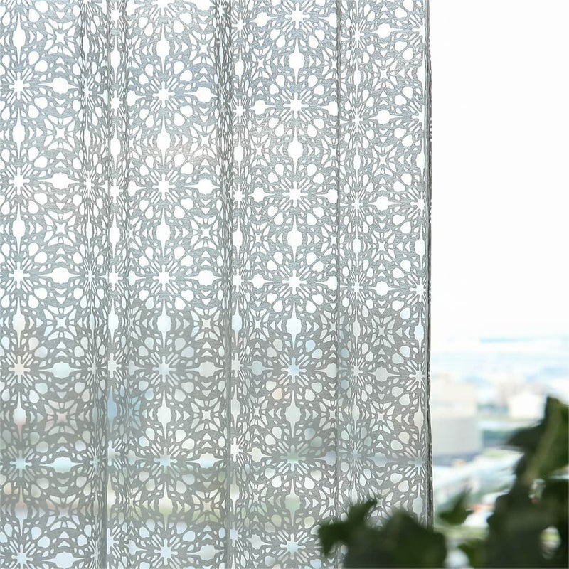レース地に施されたオパール加工が、柄の輪郭だけを残して、ふんわりと透ける軽やかな表情に。まるで切り絵細工のように、光が差し込むたびに柄が浮かび上がり、窓辺に幻想的な陰影を描き出します。