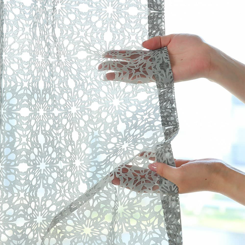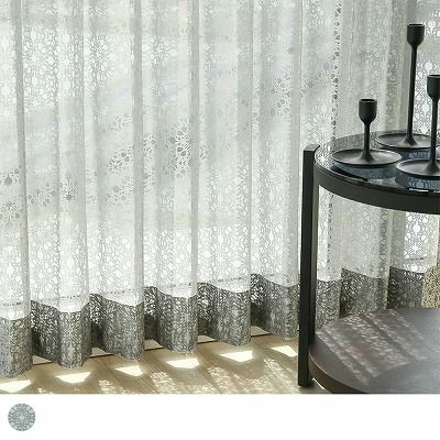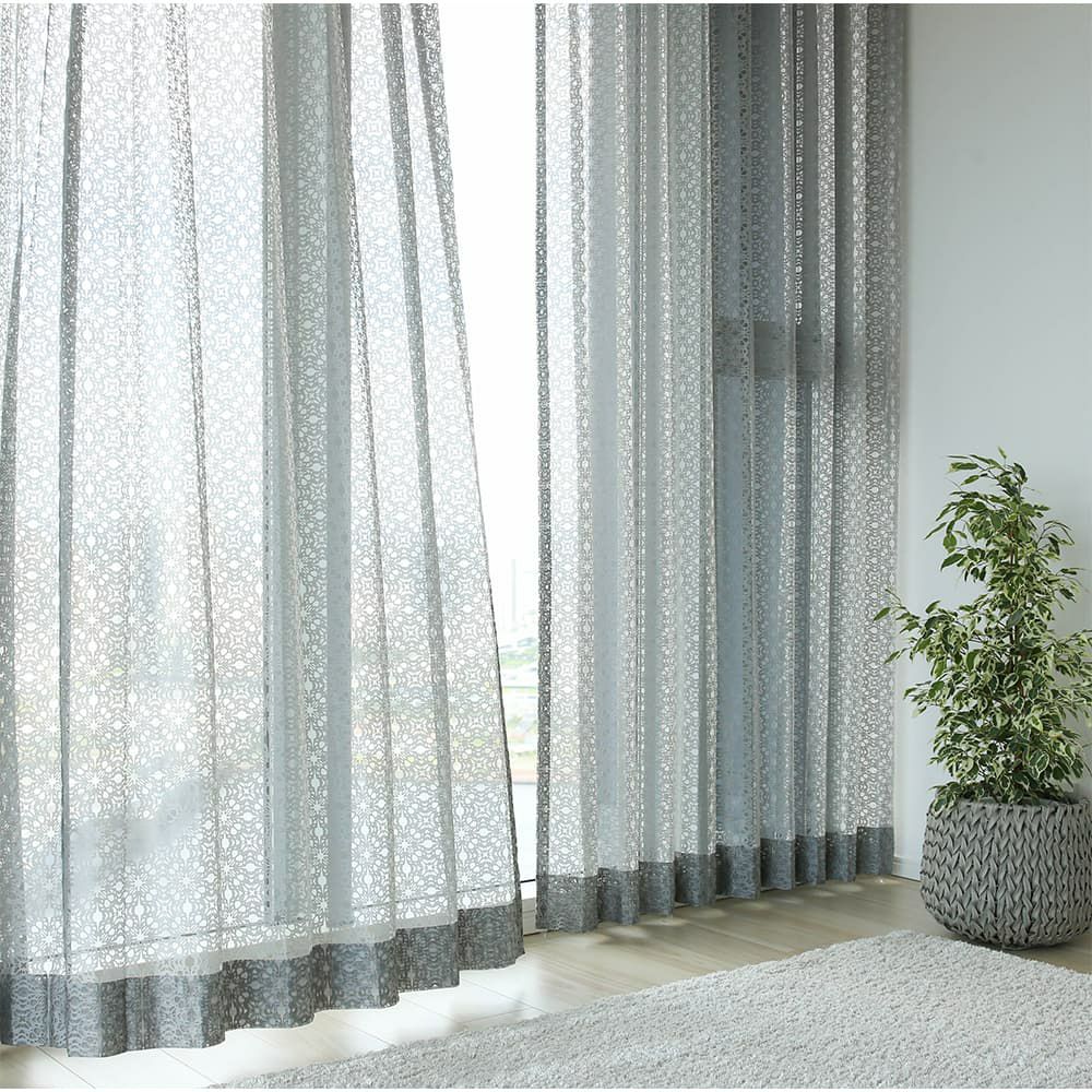 ハッと目を奪う、繊細な光沢とメタリックなニュアンス。オパール加工で描かれた、まるでアイアンフェンスを思わせるアートな柄が、軽やかなレースに映えて、洗練された窓辺を演出します。モード感と上品さを兼ね備えた、おしゃれ心をくすぐる一枚。 -