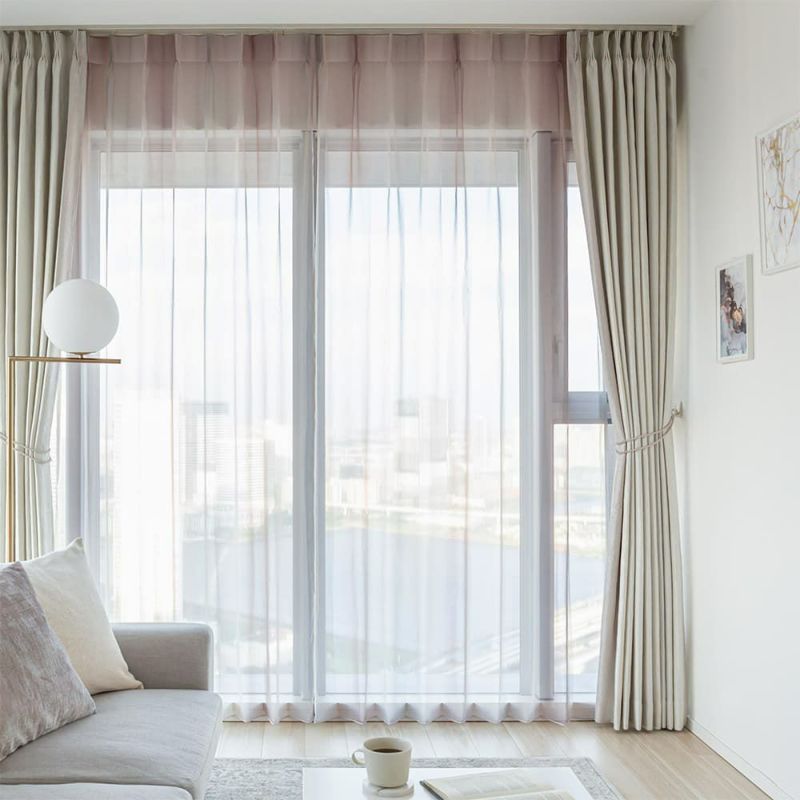 生地の重なりが生む濃淡やモアレも美しく、目を楽しませてくれるレースカーテン。窓辺に美しいフィルターをかけるように、レースカーテン越しの風景を楽しんで。