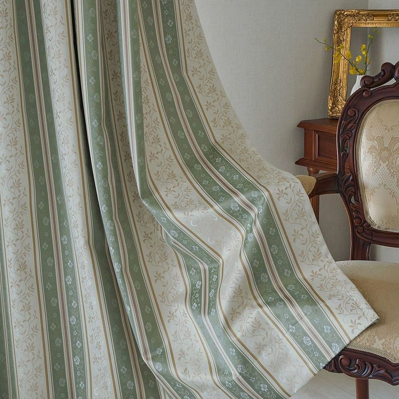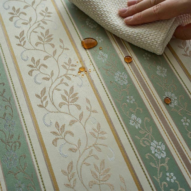 どんな空間にも馴染む優しいグリーンとベージュのストライプに、ゴールドやグレージュの細いラインを効かせたグラウンド。そこに浮かび上がる、小さな花や葉をモチーフにした繊細な蔓花模様。アラベスク調の優美な装飾と、光沢を纏った上質な生地が、空間に穏やかなエレガンスをもたらします。