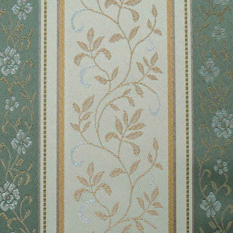 どんな空間にも馴染む優しいグリーンとベージュのストライプに、ゴールドやグレージュの細いラインを効かせたグラウンド。そこに浮かび上がる、小さな花や葉をモチーフにした繊細な蔓花模様。アラベスク調の優美な装飾と、光沢を纏った上質な生地が、空間に穏やかなエレガンスをもたらします。