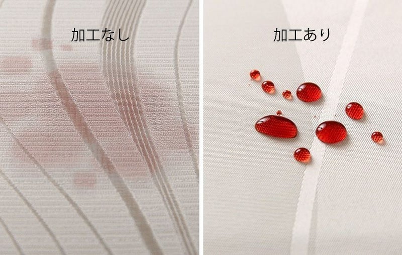 淡い色のカーテンは汚れが目立ちそう?防汚加工したカーテンなら心配ありません。 ホコリや結露がついても簡単にお洗濯でリセット。ダイニングテーブルの近くや、キッチンの窓も安心。 うっかりこぼしてしまったジュースや、ソースの汚れも防汚加工が繊維の奥に入り込まないようにガードしてくれます。