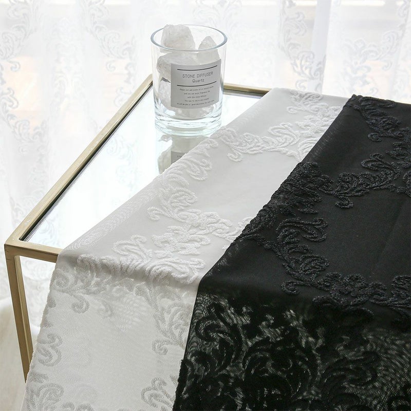 窓に飾ると、グラウンドの透け感とデザイン部分のコントラストがよりいっそう美しく映えます。圧倒的な華やかさを添えるブラックと、光に溶け込むような透明感のあるアイボリー。どちらもエレガントな装いを叶えます。窓辺がインテリアの主役になりそうな、華やかなレースカーテン。