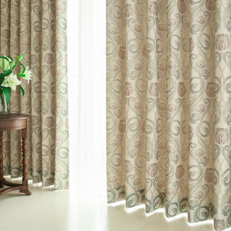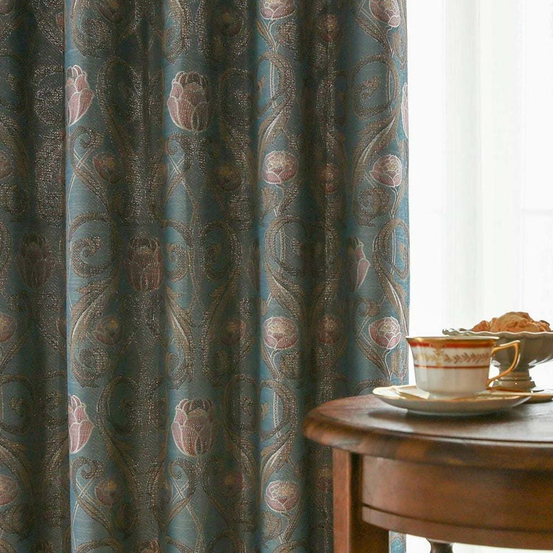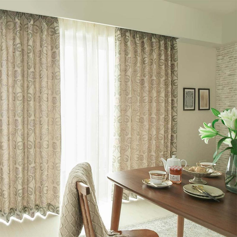 高級感のあるジャガード織りのテキスタイルをカーテンにお仕立てしました。英国の香りを漂わせるクラシカルなデザインが、ノスタルジックな世界へと誘う。陽を通してほんのり橙に染まる表情からも、ジャガード織の豊富な糸使いを感じます。