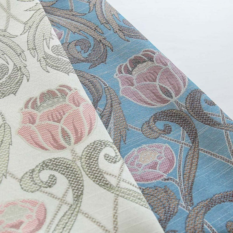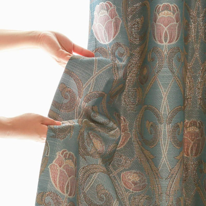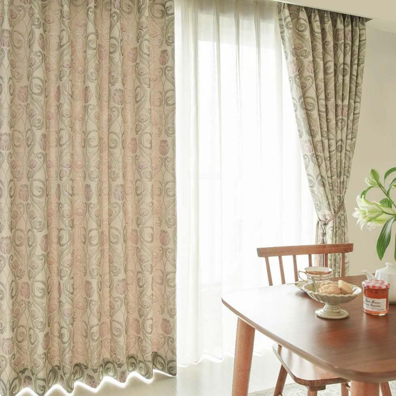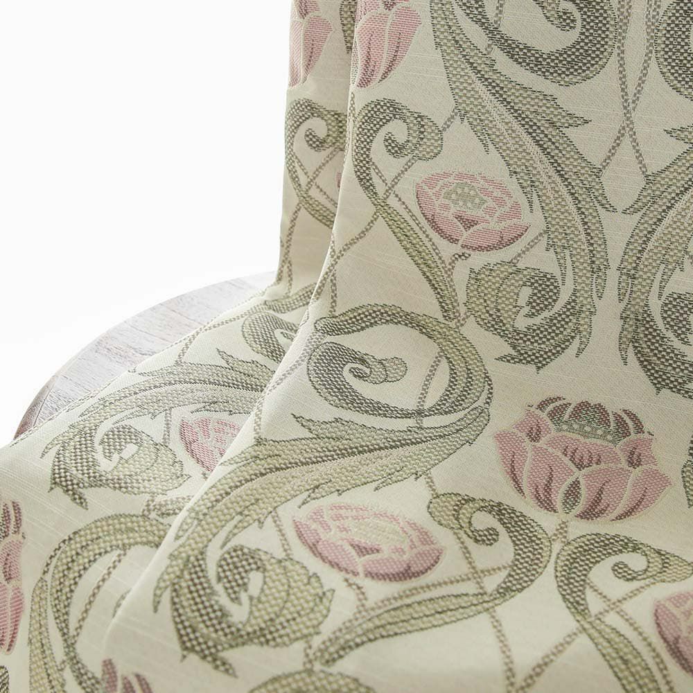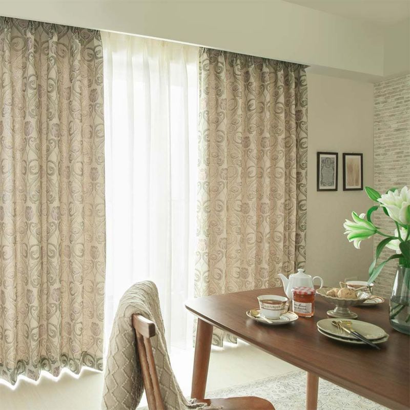 ジャガードはプリントと違い柄が主張しすぎる事が無く、部屋に溶け込んで、穏やかに華やかさを添えます。 ゆったりとしたドレープのヒダから見え隠れする柄は見る角度によって、様々な表情を見せてくれる。