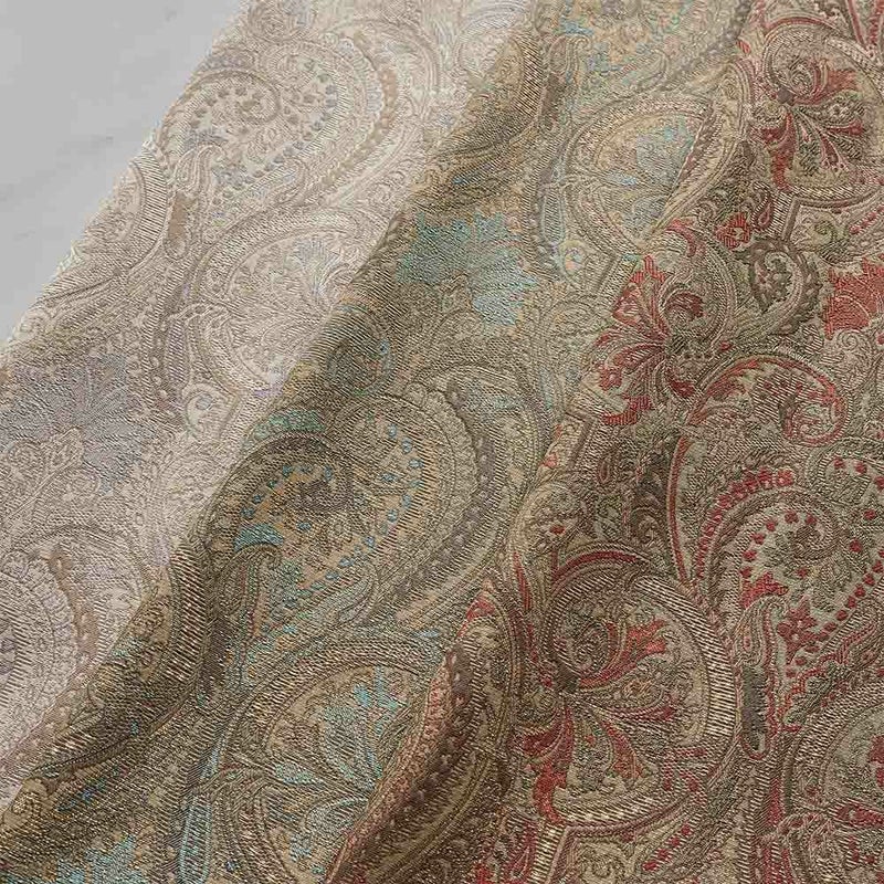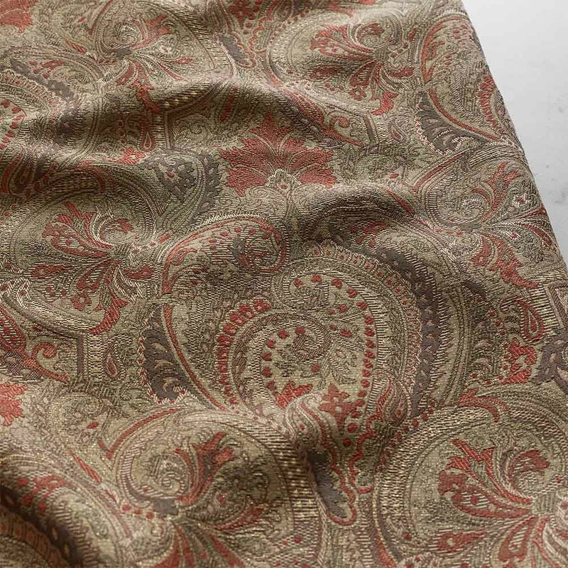 グラウンドには、掠れたようなゴールドのテクスチャーを入れ、ヴィンテージを感じさせる曖昧さが美しい生地感。光沢糸のエッセンスが加えられ、いきいきとした表情を惹きたてます。優美に描かれたペイズリー柄は、窓一面を美しく彩ります。ジャガードならではの、奥行きのある繊細な表現が魅力です。