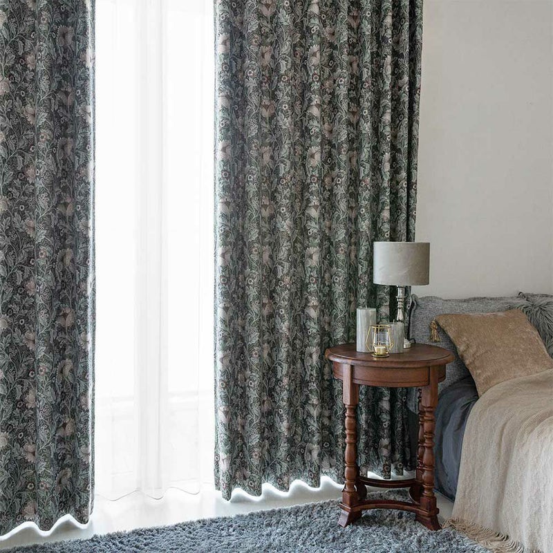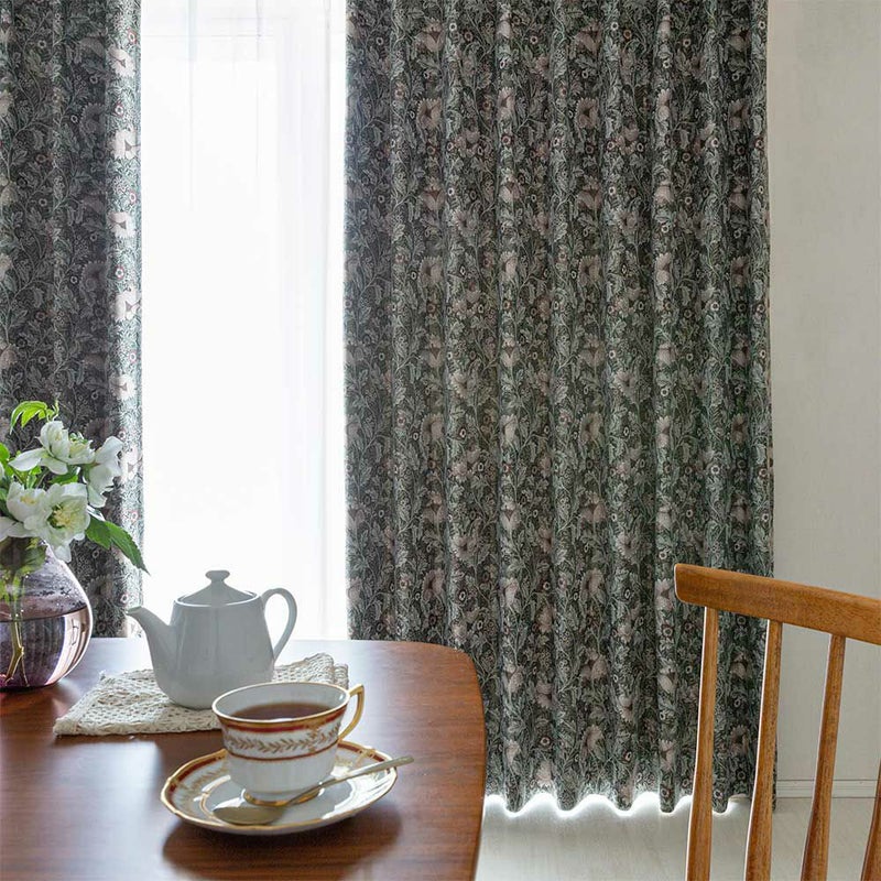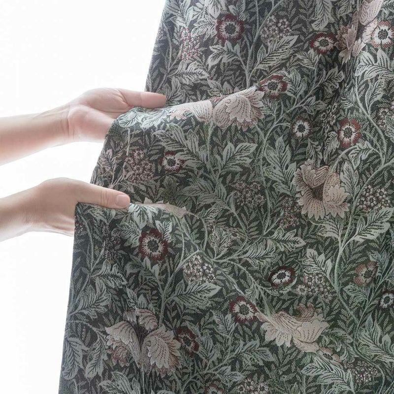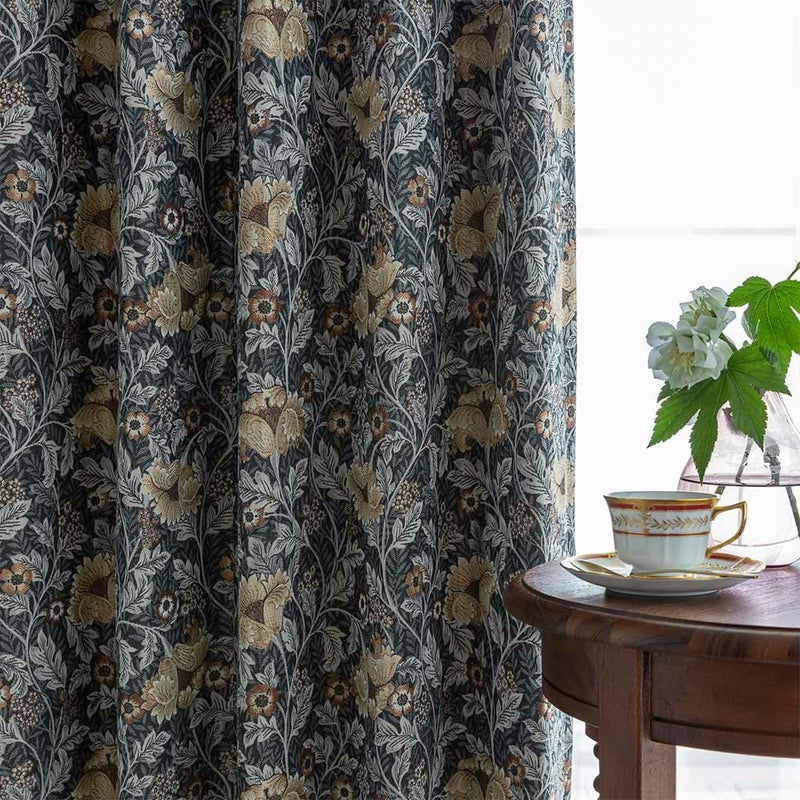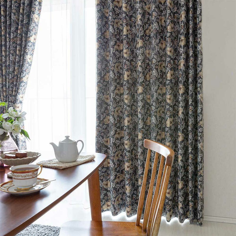ダークトーンをベースに、くすんだ色合いの草花を散りばめた、重厚感溢れるジャガードカーテン。