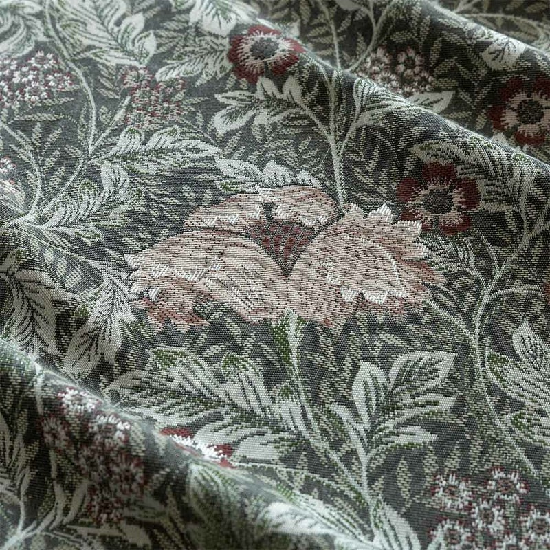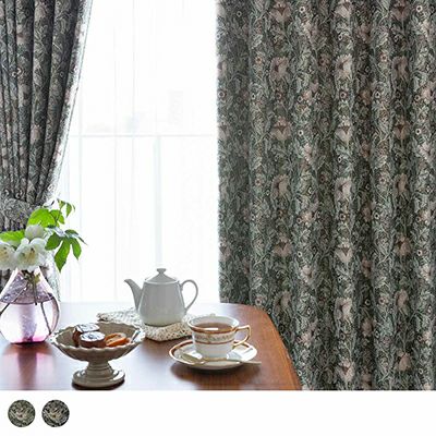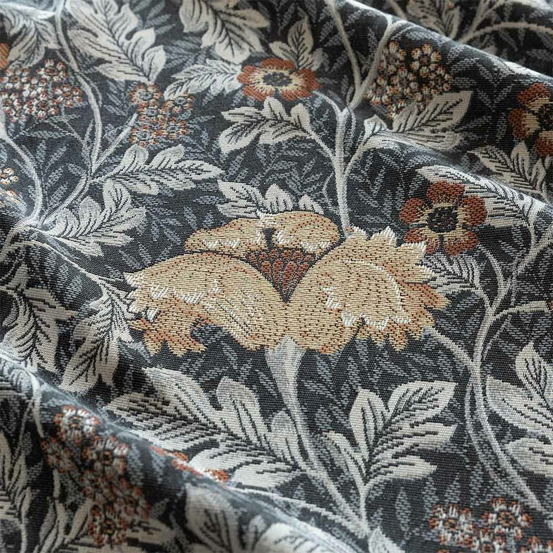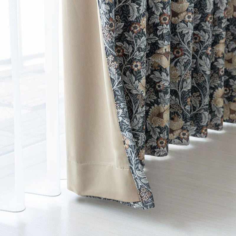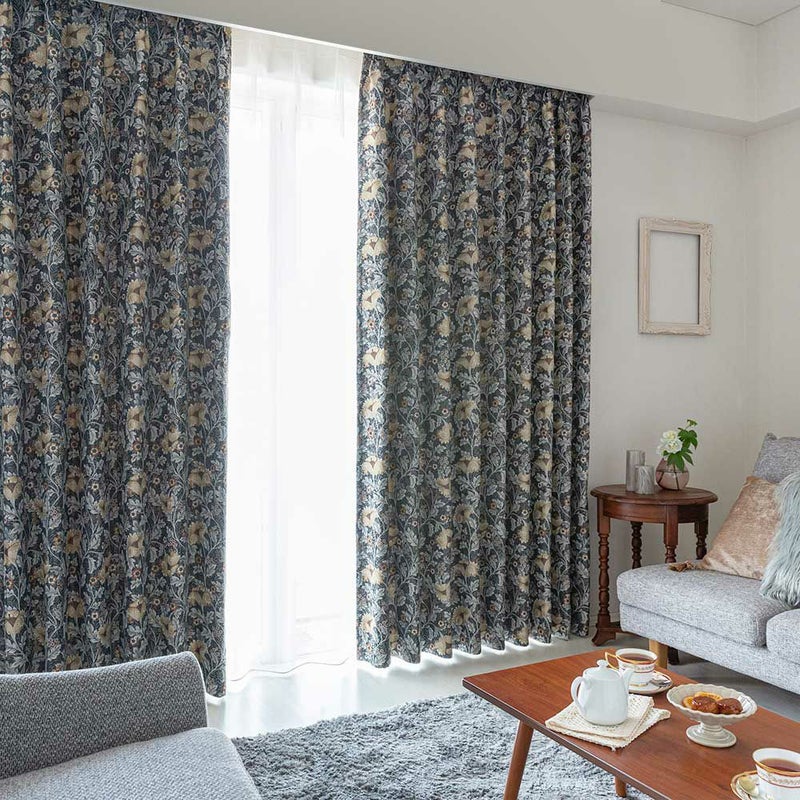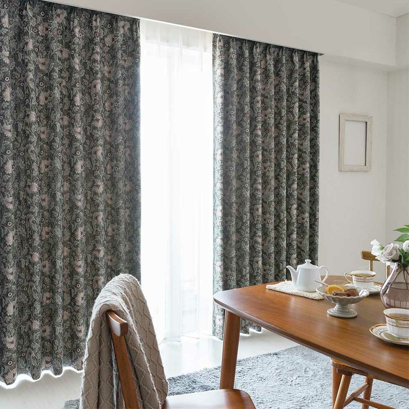 ダークトーンをベースに、くすんだ色合いの草花を散りばめた、重厚感溢れるジャガードカーテン。