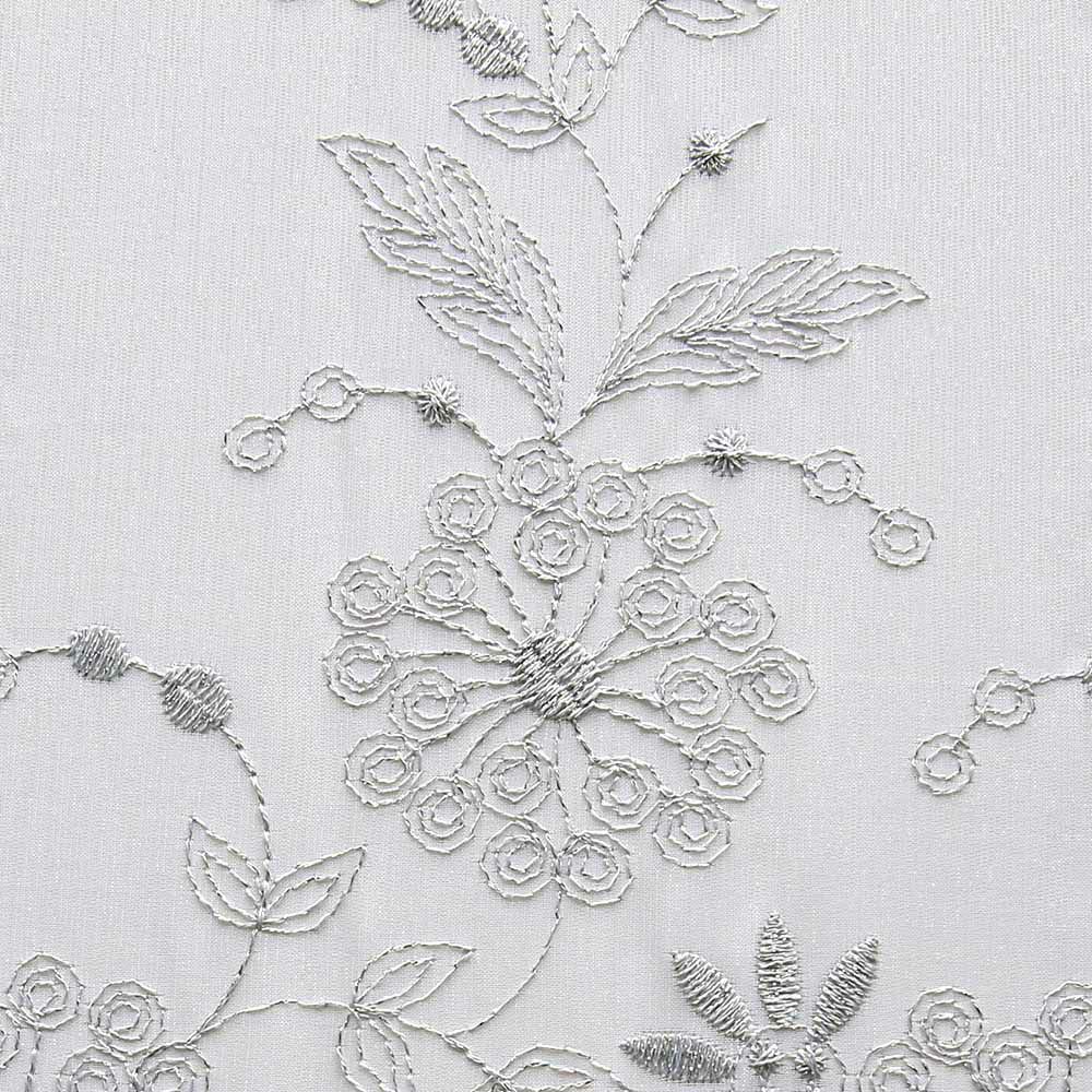 ラメ糸で描いた花々が輝きを放つ、見事な刺繍。見れば見るほど繊細で、手の込んだテキスタイルにうっとりしてしまうほど。洗練されたクールな雰囲気が美しい、特別なエンブロイダリーレースカーテン。