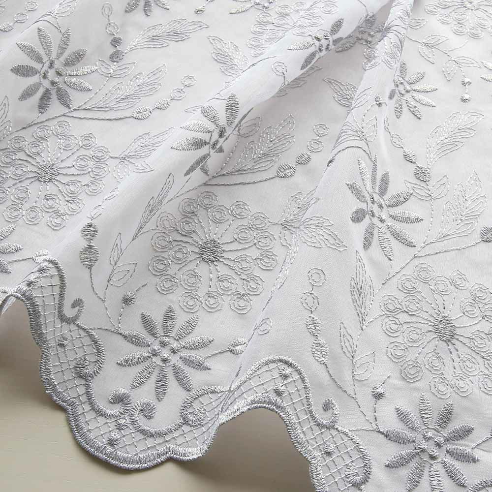 まるで、お花がダンスしているような心をくすぐるエンブロイダリーレースカーテン。刺繍は裾の辺りは濃密に、上へ向かうごとに一凛の花が散りばめられた、抜け感のあるデザイン。裾から256cmの位置まで刺繍が施してあるため、高さの低い窓よりも、大きな窓にこそ映える一枚です。