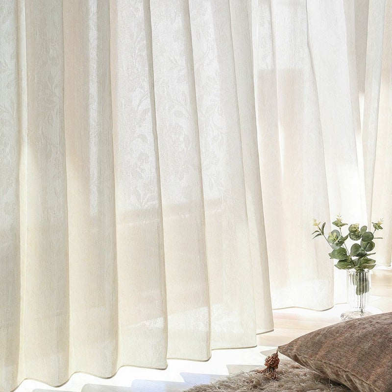 ヤマブキの花が咲く様子を、ナチュラルに表現した上品なテキスタイル。薄いレースカーテンの素材に、繊細な織りによって浮かび上がらせました。光の加減で見え隠れするそのさり気なさは、儚く美しい窓辺を叶えます。