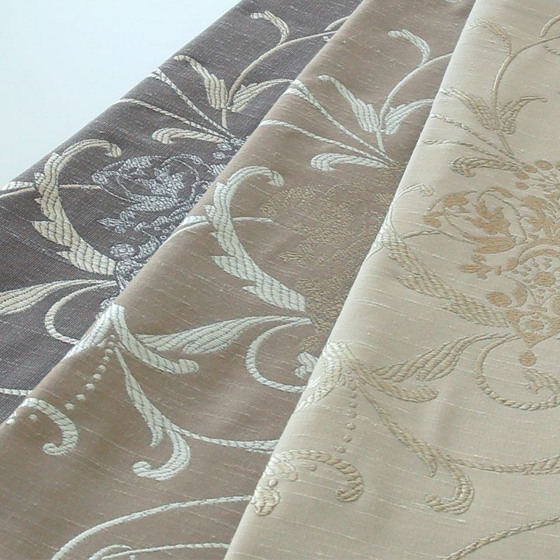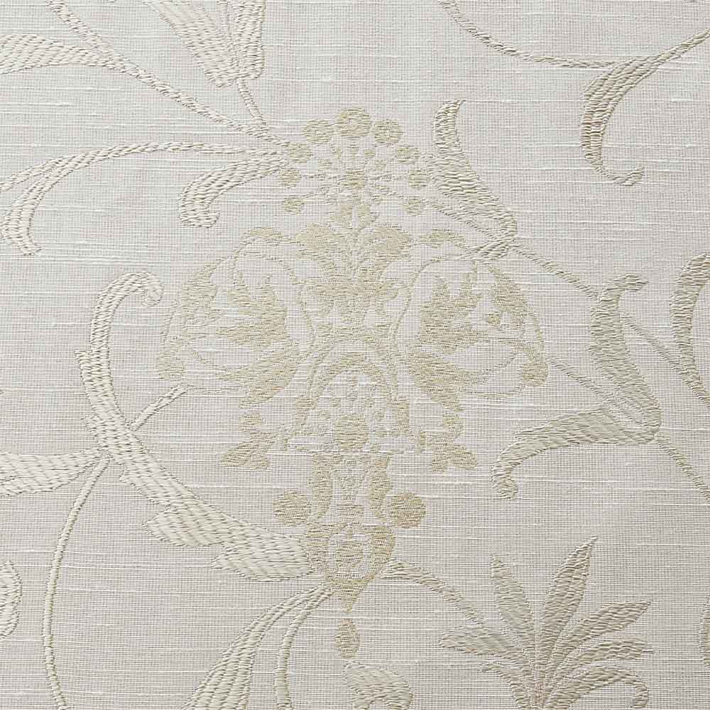 とても繊細な柄を、ジャガード織で遺憾なく表現した一枚。グラウンドは、よこ糸に素朴な風合いの糸と光沢のある糸を使い分け、素材感にコントラストを持たせました。さらに、二重織りにすることで空気の層ができ、柔らかい質感が生まれます。更紗文様は光沢糸で緻密に織り上げ、美しく輝きを放つ。巧妙な技術で生まれた、至高のジャガードカーテンです。